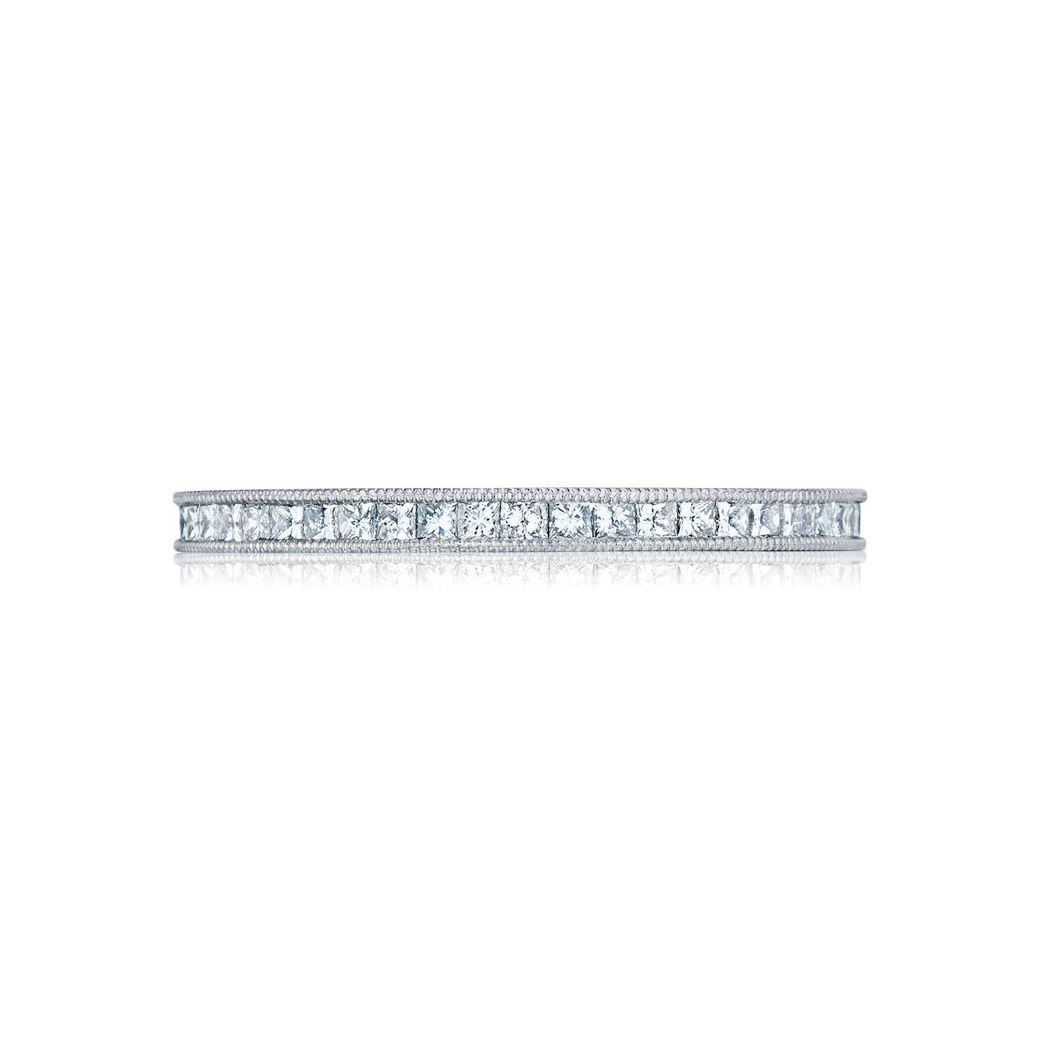 A single, pure row of bright channel set princess cut diamonds link in an eternal circle, with lace-like crescents and milgrain detail on both sides.