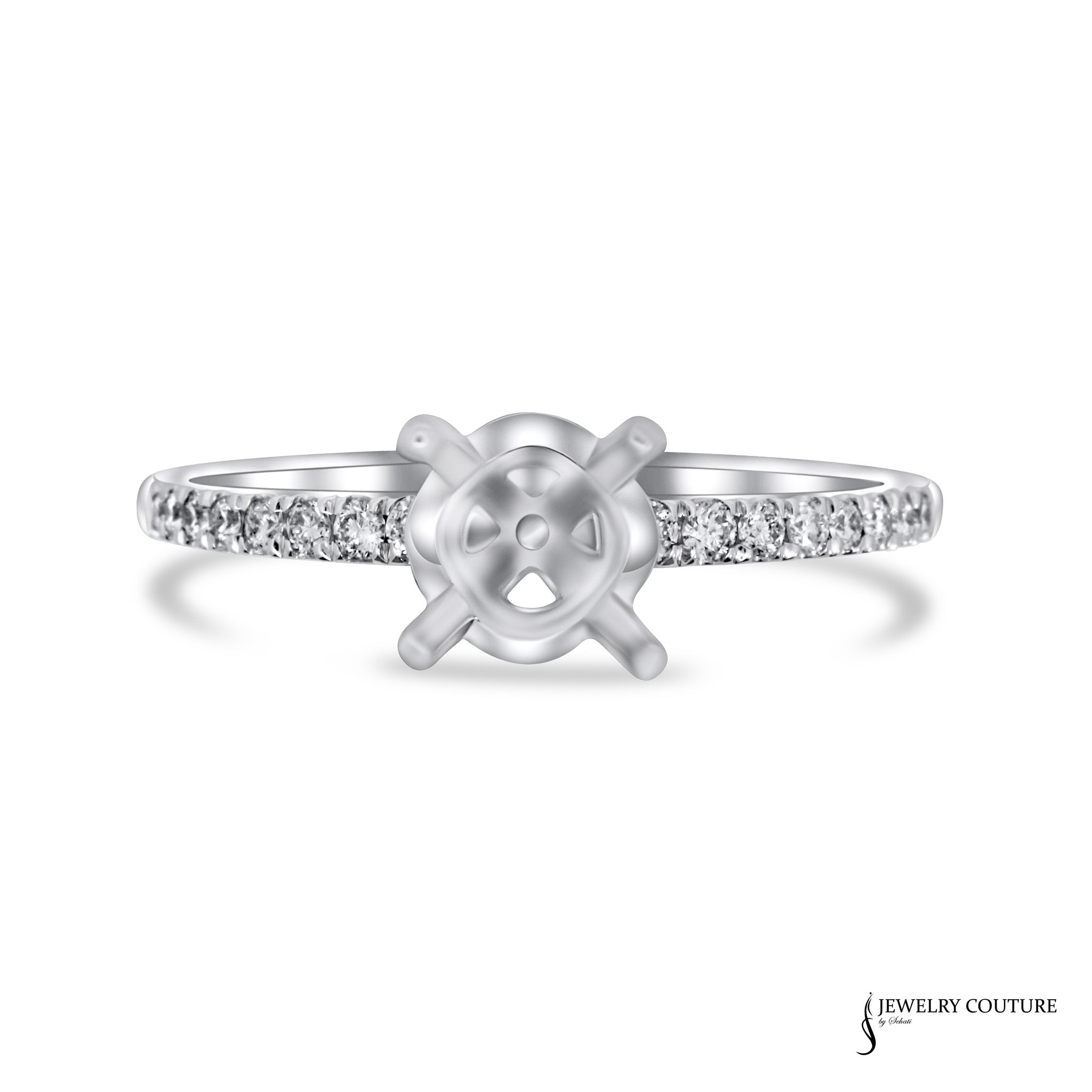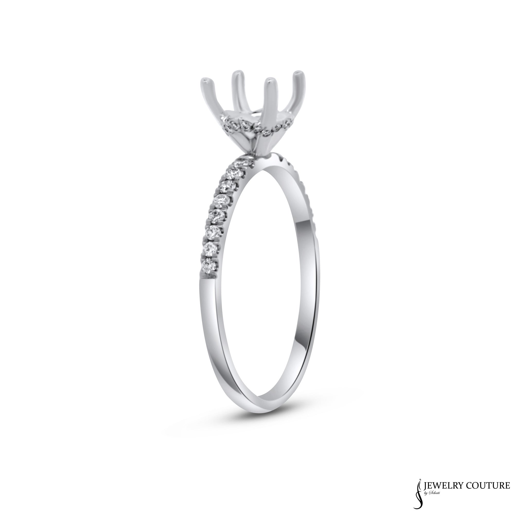 This timeless semi-mount ring is created with 14KT White Gold and adorned with 0.20CT of Total Weight Diamond.
