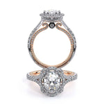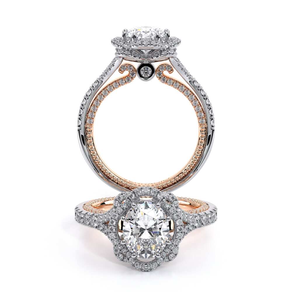 COUTURE-0444OV One of a Kind Double Floret Engagement ring that features a pave set cathedral diamond band the subtle sparkle of our half diamond Riviera adorned with the Verragio Crest and our Verragio Signature Beading completed with the Couture shank.