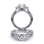 COUTURE-0450R Timeless Twist Round three stone Engagement ring that features a pave set cathedral diamond band the subtle sparkle of our half diamond Riviera adorned with the Verragio Crest and Signature Beading completed with the Couture shank.