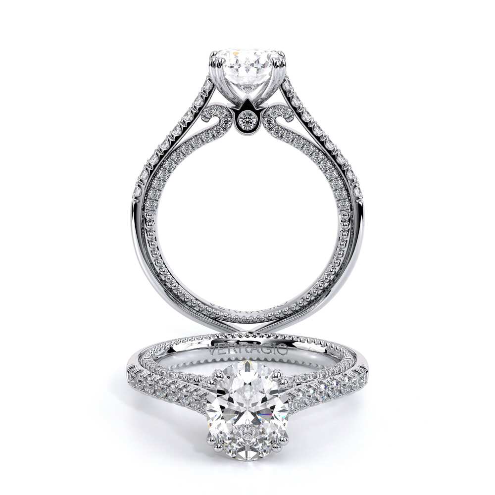COUTURE-0452OV Classically simple Oval Engagement ring that features a pave set cathedral diamond band the subtle sparkle of our half diamond Riviera adorned with the Verragio Crest and our Verragio Signature Beading completed with the Couture shank.