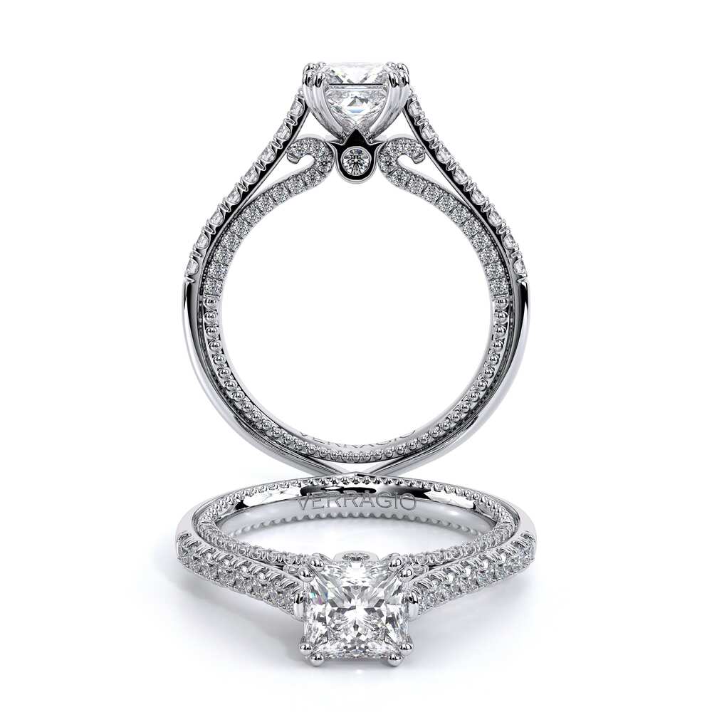 COUTURE-0452P Classically simple Princess Engagement ring that features a pave set cathedral diamond band the subtle sparkle of our half diamond Riviera adorned with the Verragio Crest and our Verragio Signature Beading completed with the Couture shank.