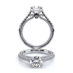 COUTURE-0452R Classically simple Round Engagement ring that features a pave set cathedral diamond band the subtle sparkle of our half diamond Riviera adorned with the Verragio Crest and our Verragio Signature Beading completed with the Couture shank.