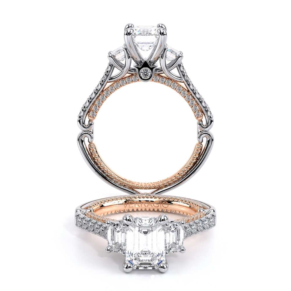 COUTURE-0470EM Beautiful Emerald three stone Engagement ring pave set with round brilliant diamonds adorning the Verragio Crest and half Diamond Riviera along with our Verragio Signature Beading profile completed with the Couture shank.