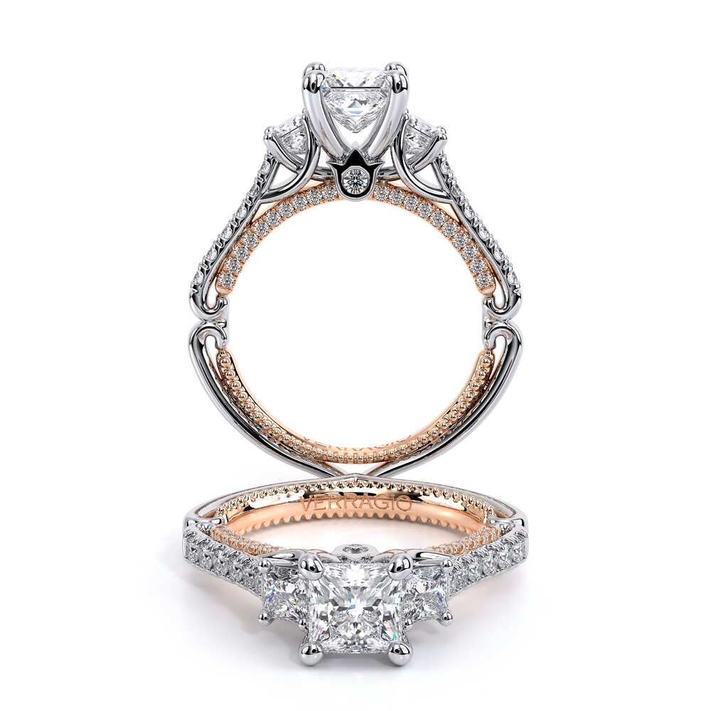 COUTURE-0470P Beautiful Princess three stone Engagement ring pave set with round brilliant diamonds adorning the Verragio Crest and half Diamond Riviera along with our Verragio Signature Beading profile completed with the Couture shank.