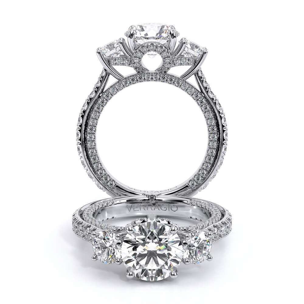 COUTURE-0479R is our new Three Stone Engagement ring highlighting our meticulously set diamond bridge elevating the surrounding round side stones. With the addition of our 3/4 Diamond Riviera and Verragio's signature crest the brilliance of this style is