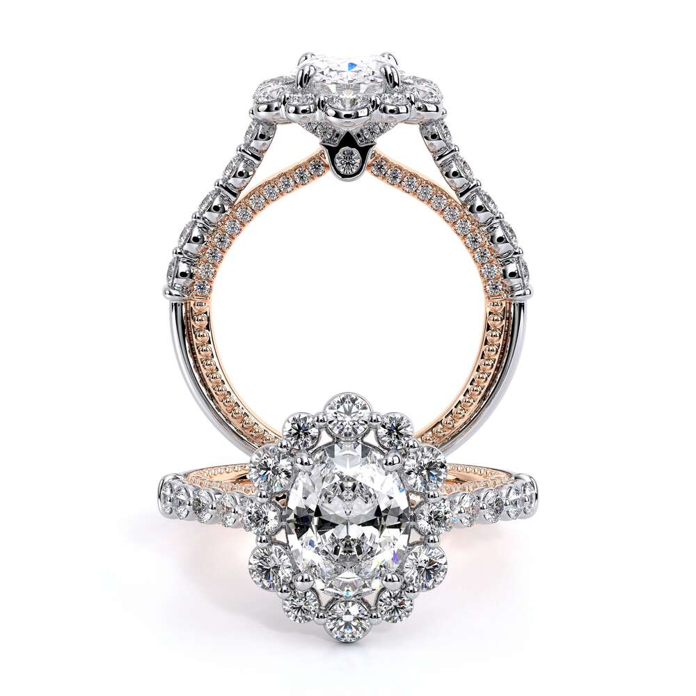 COUTURE-0480OV Features bezel set brilliant-cut diamonds on our new Amore halo with meticulously set diamonds on a straight band. All details are elevated with the addition of our 1/2 Diamonds Riviera with Verragio's timeless signature crest and beading.