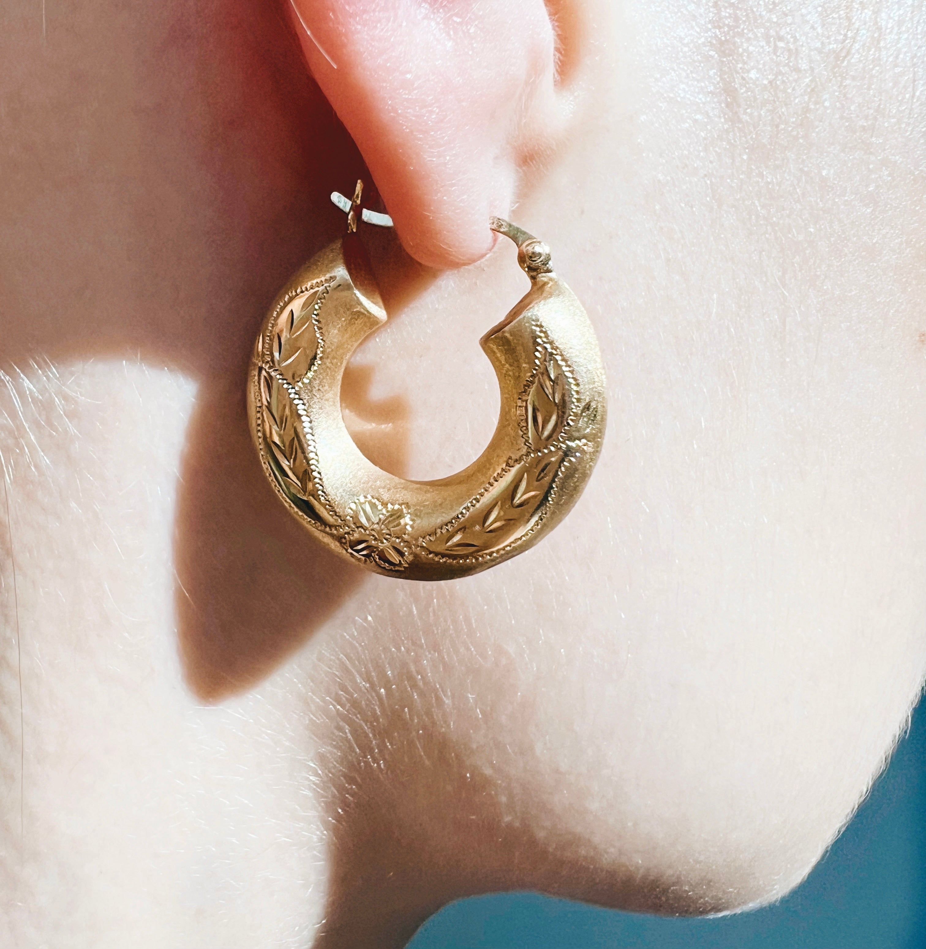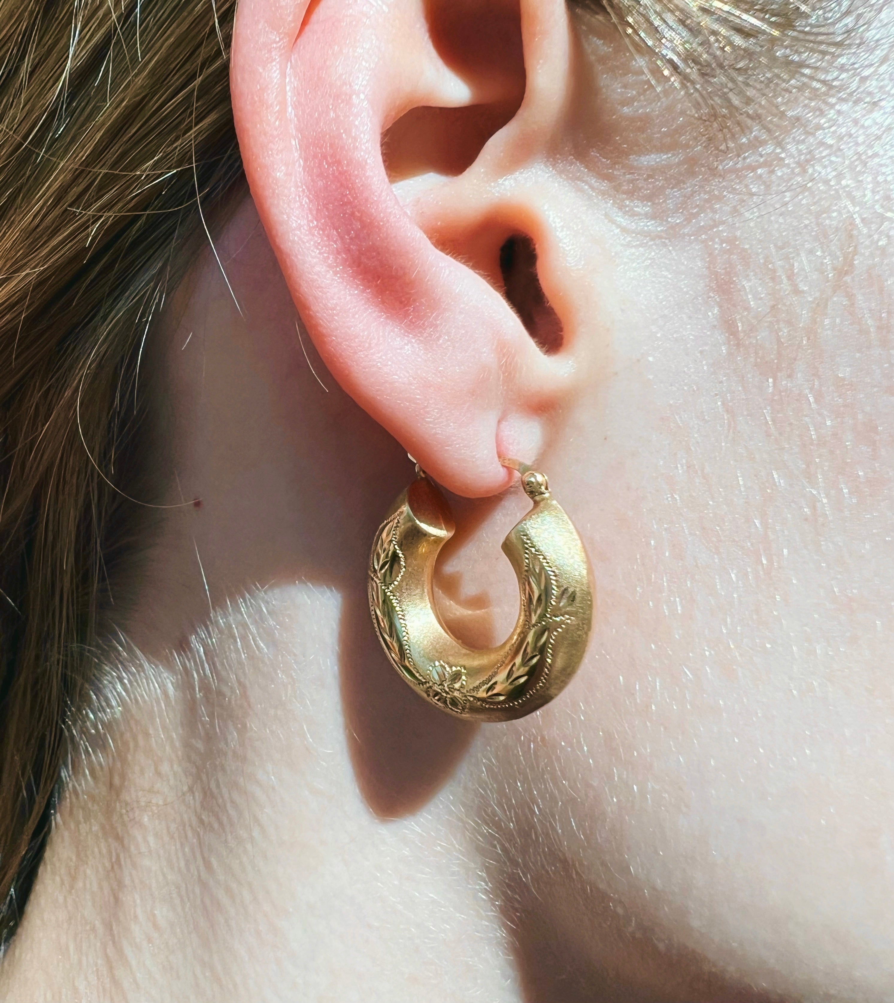 Expertly crafted from solid 14K yellow gold, these earrings boast a soft matte finish that enhances their vintage-inspiredaesthetic. The hand-carved floral details evoke a sense of old-world romance, making them an exquisite choice for any jewelry collector. Designed for both everyday elegance and special occasions, these gold hoop earrings bring a refined, heirloom-quality appeal to any look.