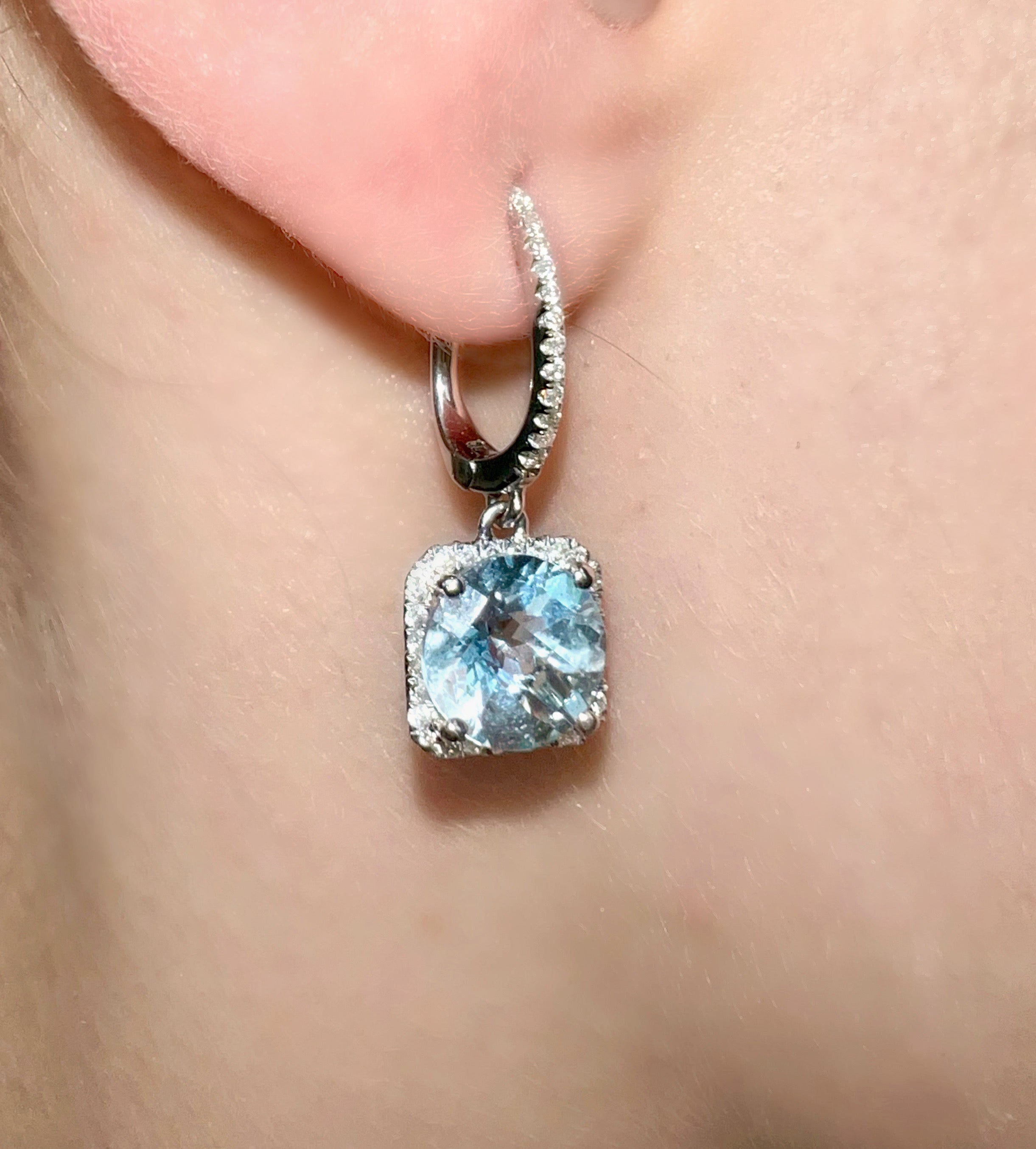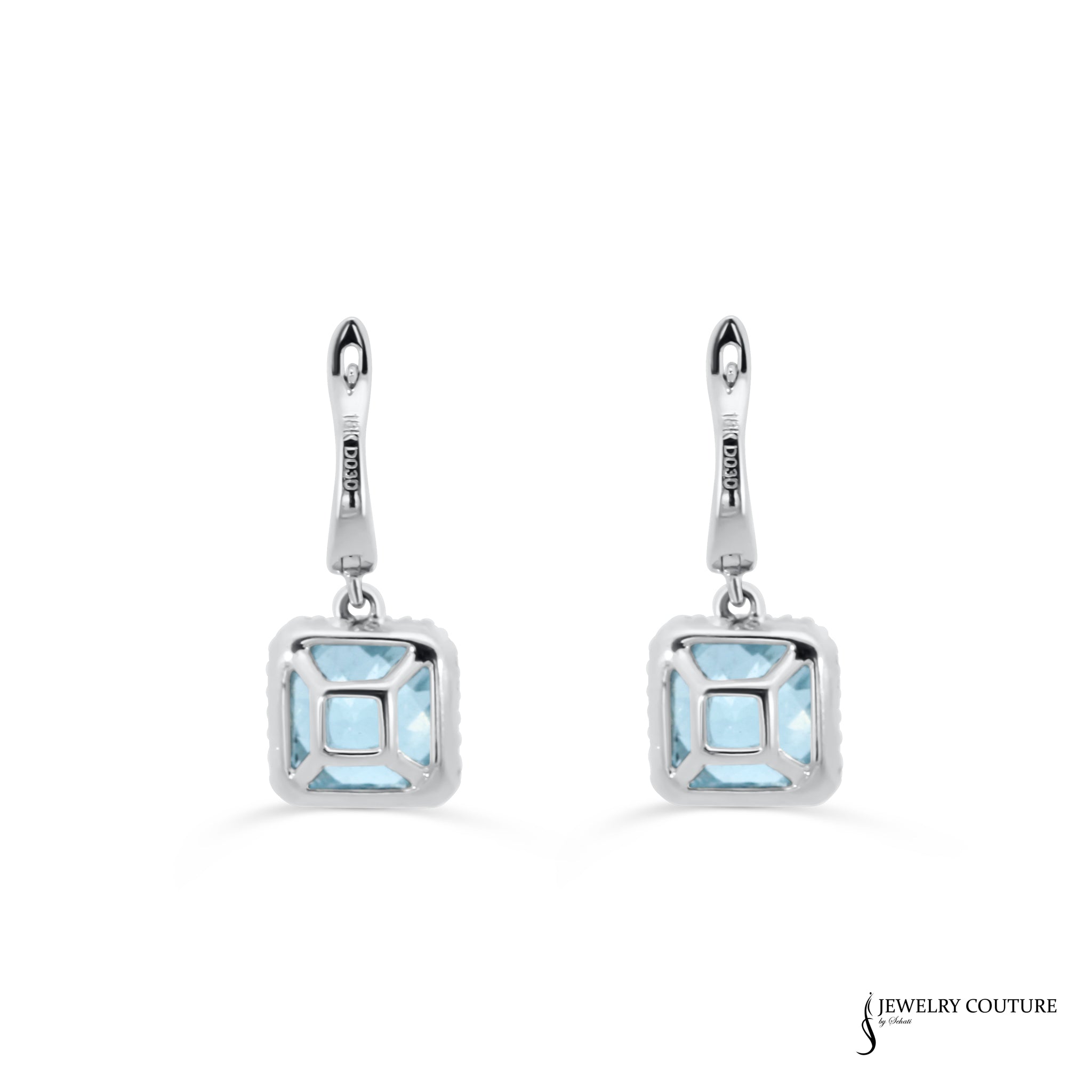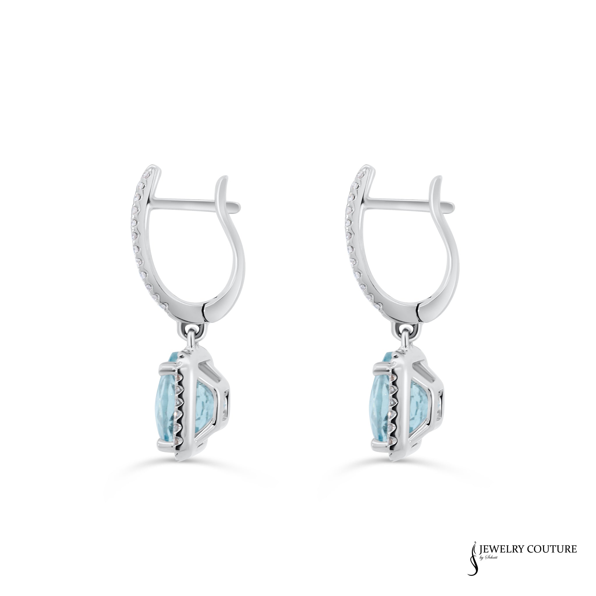 Add a touch of elegance to your look with these exquisite 14KT White Gold Dangle Earrings, featuring luminous round aquamarine gemstones that radiate a tranquil blue glow. Accentuated by 0.25CT total weight of sparkling diamonds, these earrings offer the perfect blend of sophistication and brilliance. The delicate dangle design allows for graceful movement, making them a stunning choice for both everyday wear and special occasions.