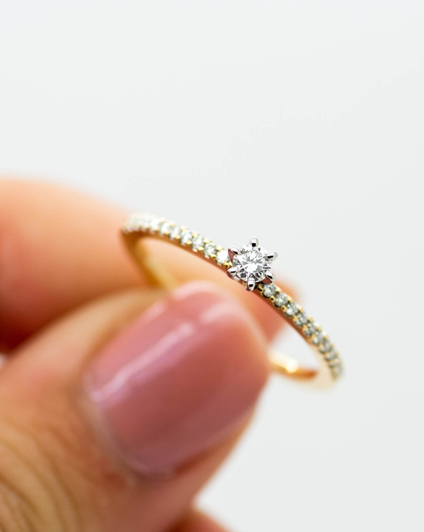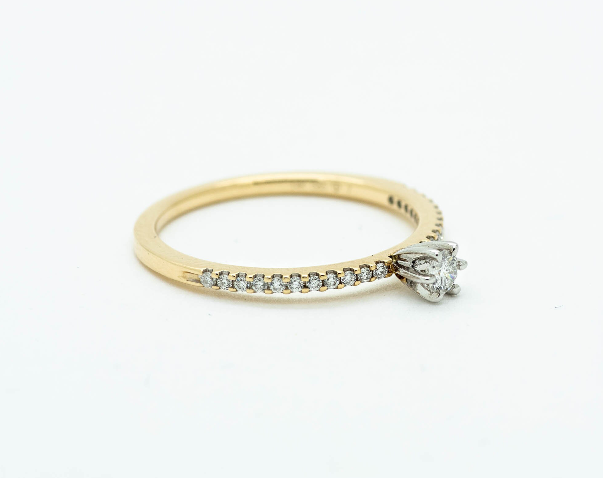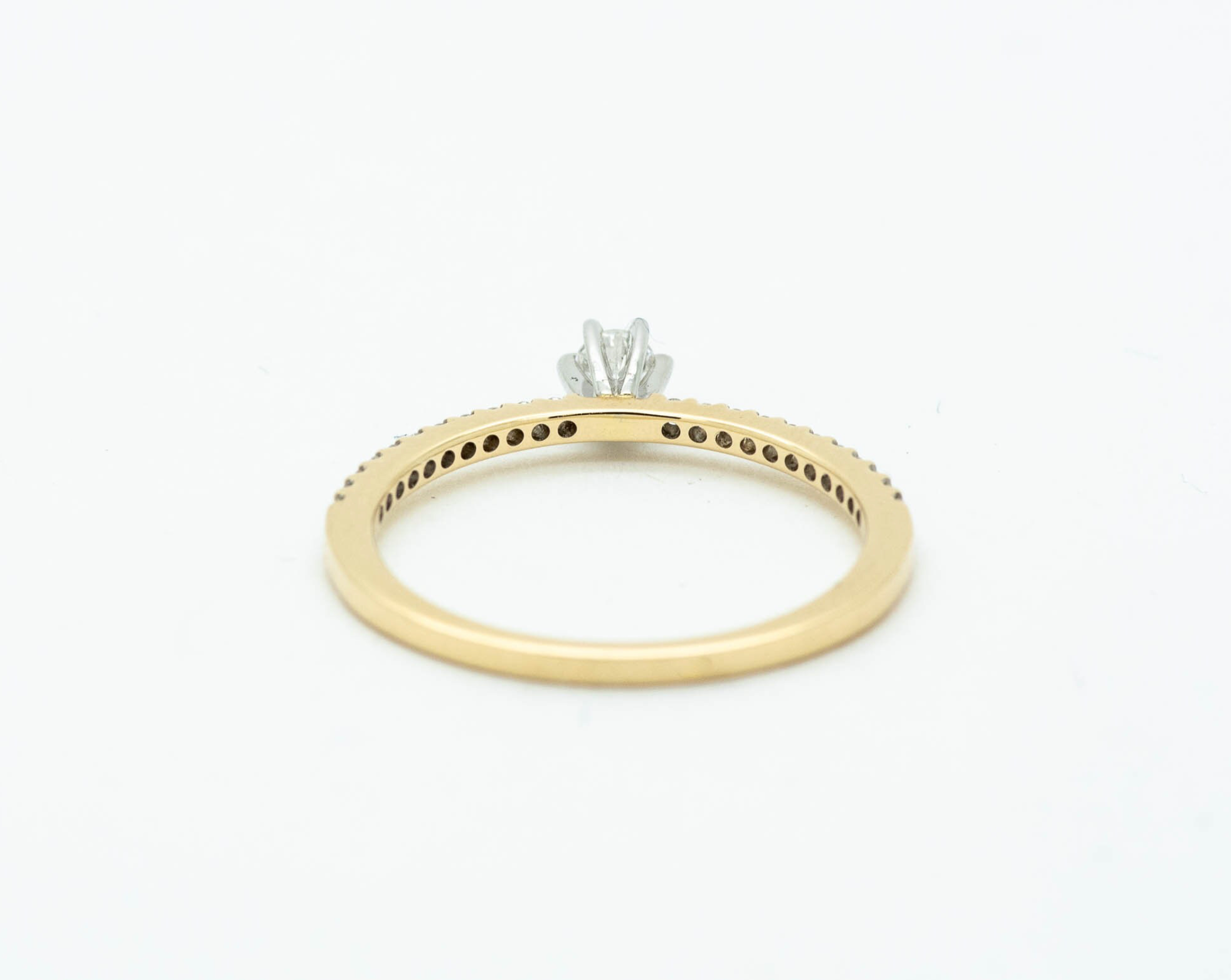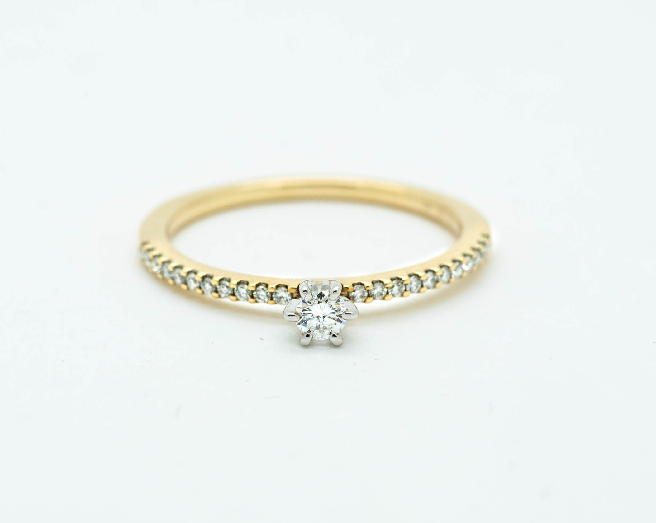 14K Yellow Gold Diamond Solitaire Ring, featuring a brilliant round-cut diamond centerpiece set in a secure six-prong white gold setting. The slender yellow gold band is adorned with a delicate pavé of sparkling accent diamonds totaling 0.19 carats (CTW), offering a timeless yet modern look.