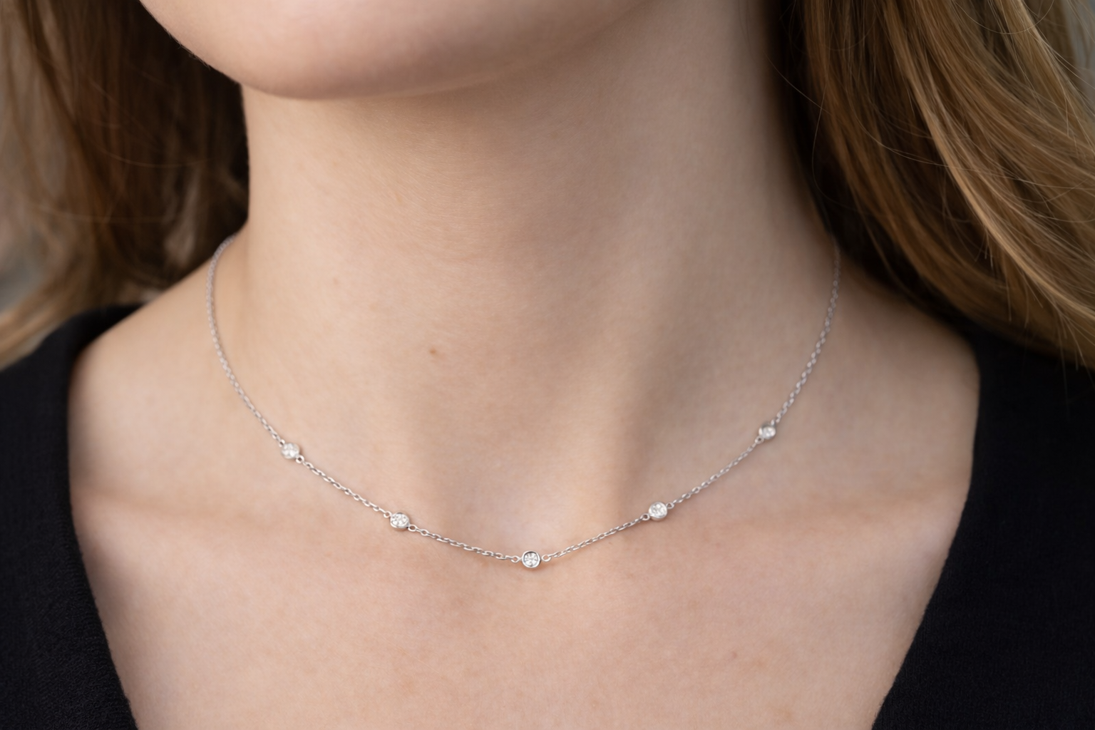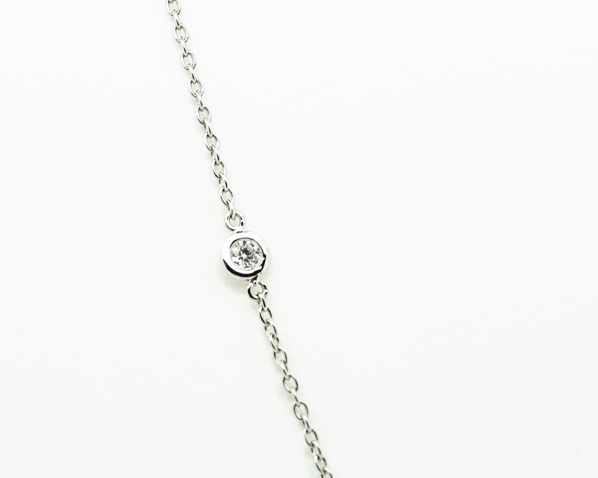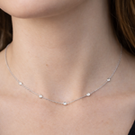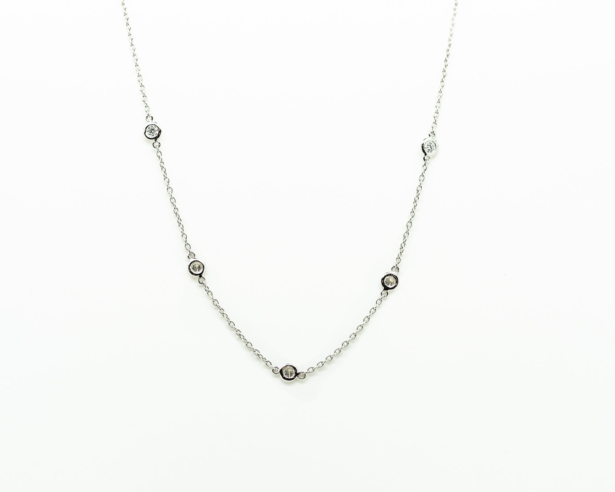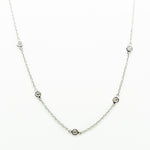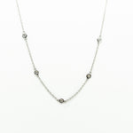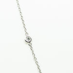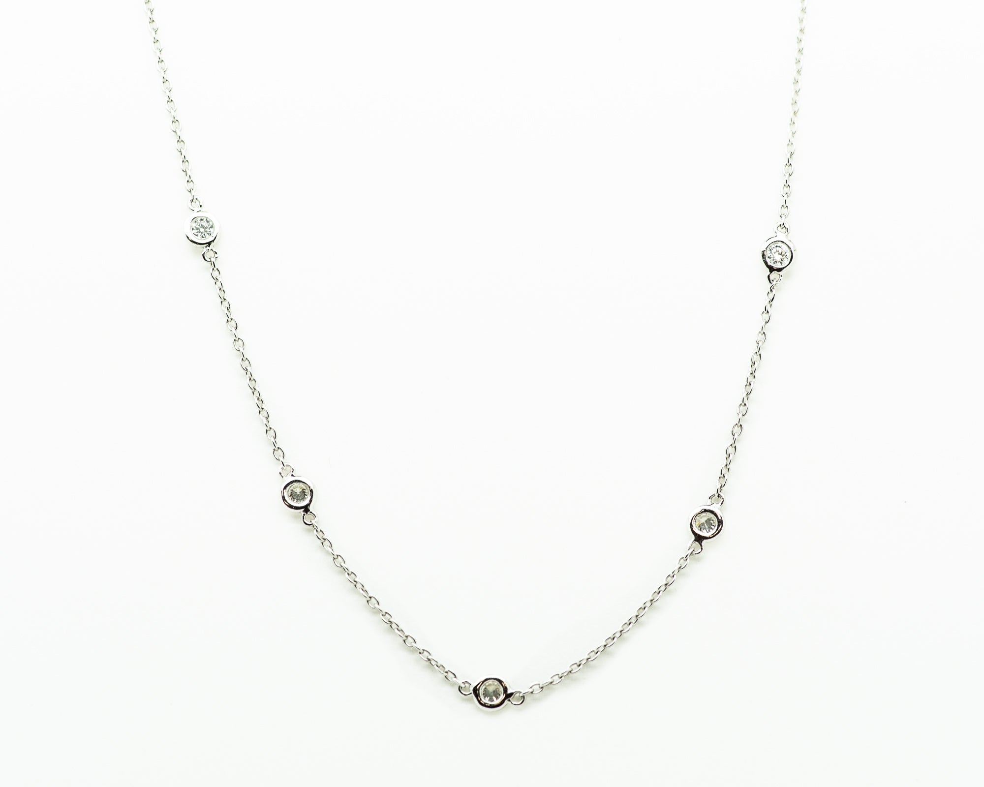 14kt white gold diamonds by the yard necklace containing 5 round diamonds set in bezel settings equaling approximately 0.18ctw, 17"inch necklace secures with a lobster claw clasp.
