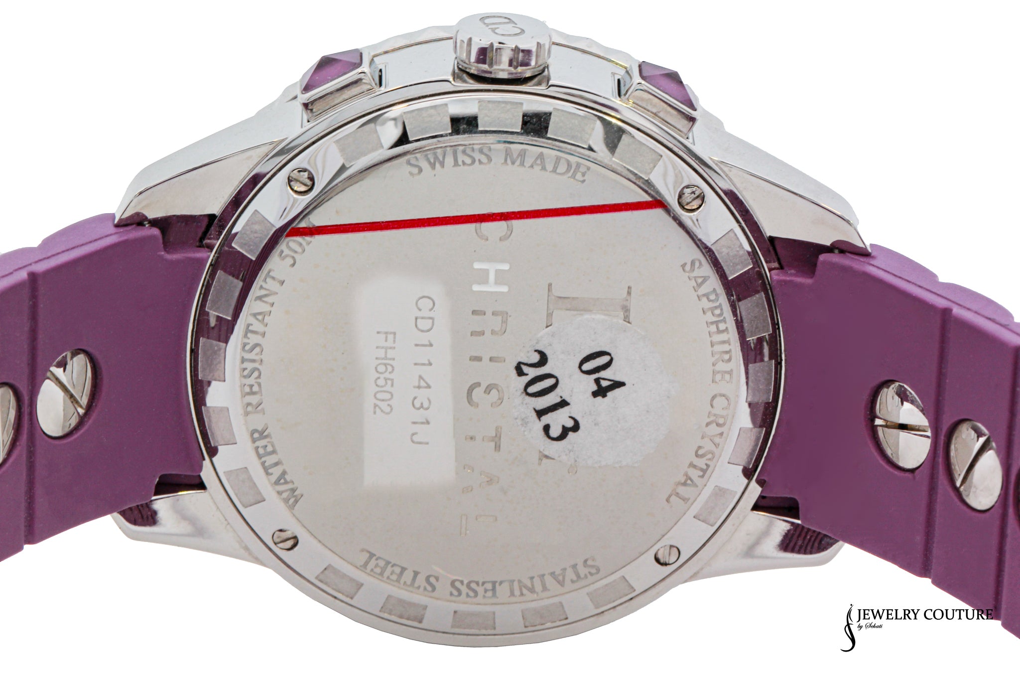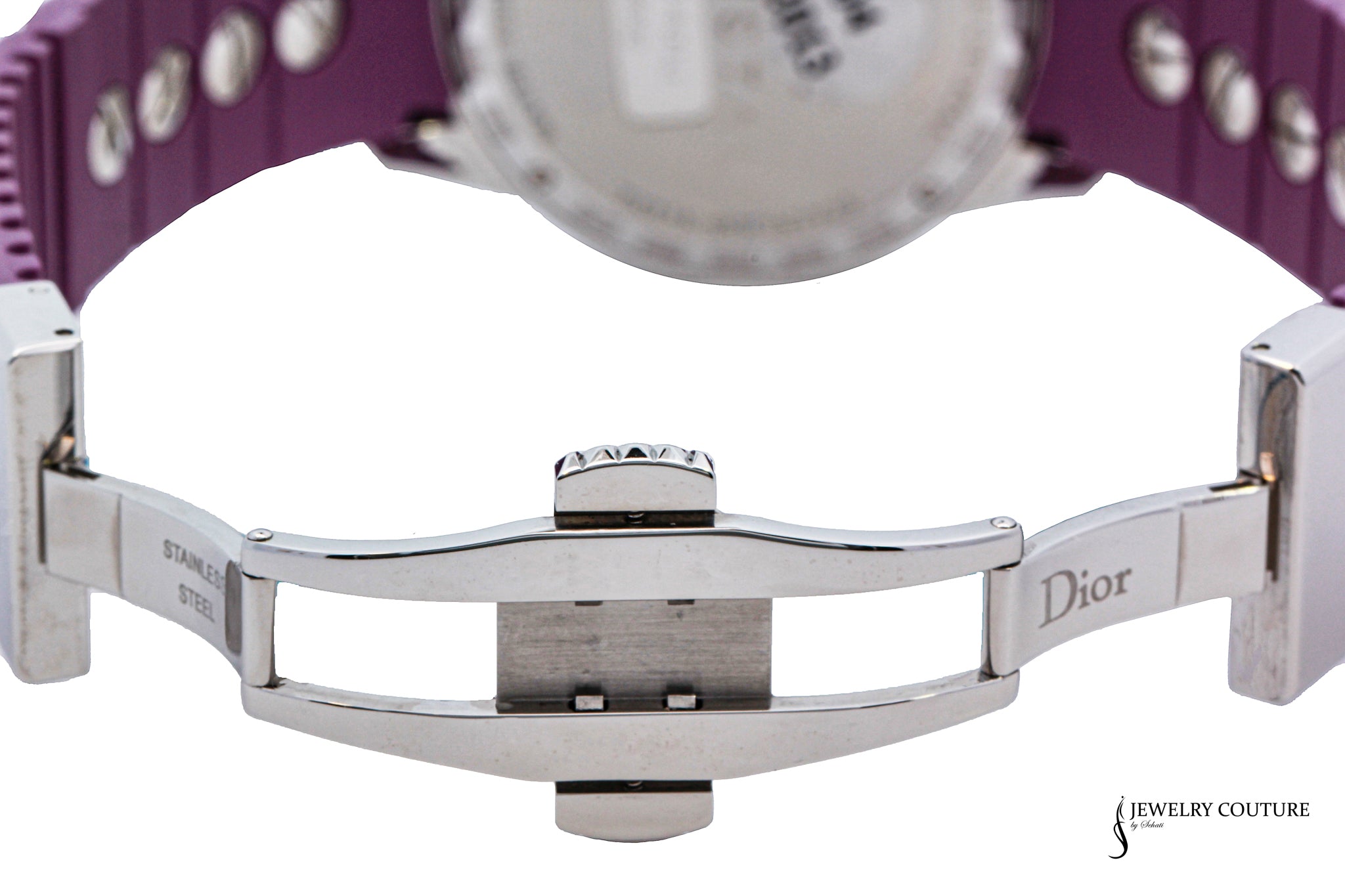 This Dior Purple watch features a beautiful purple rubber bracelet with 1 row of purple ruby, adding a touch of elegance and color. The watch face is adorned with sparkling diamonds and a purple crystal dial, making it both stylish and functional.