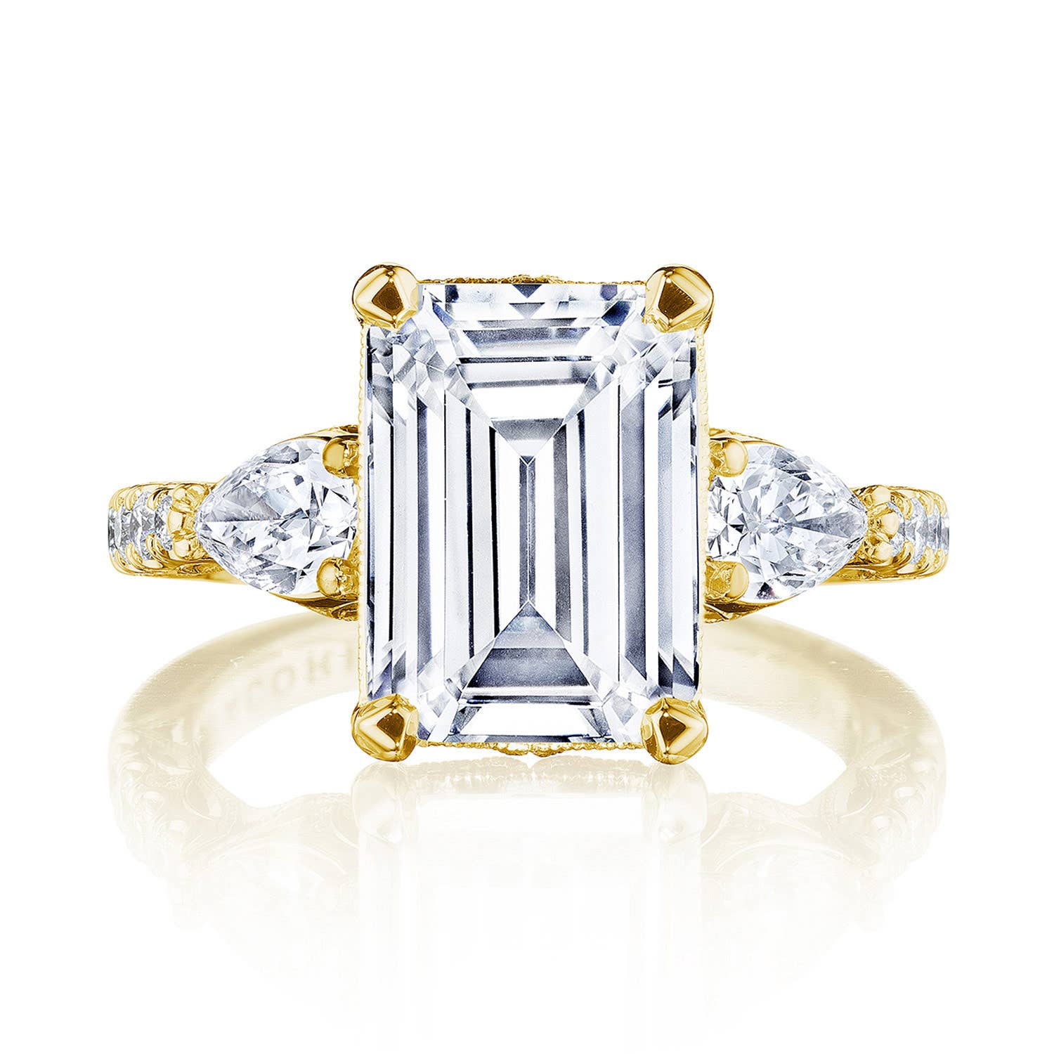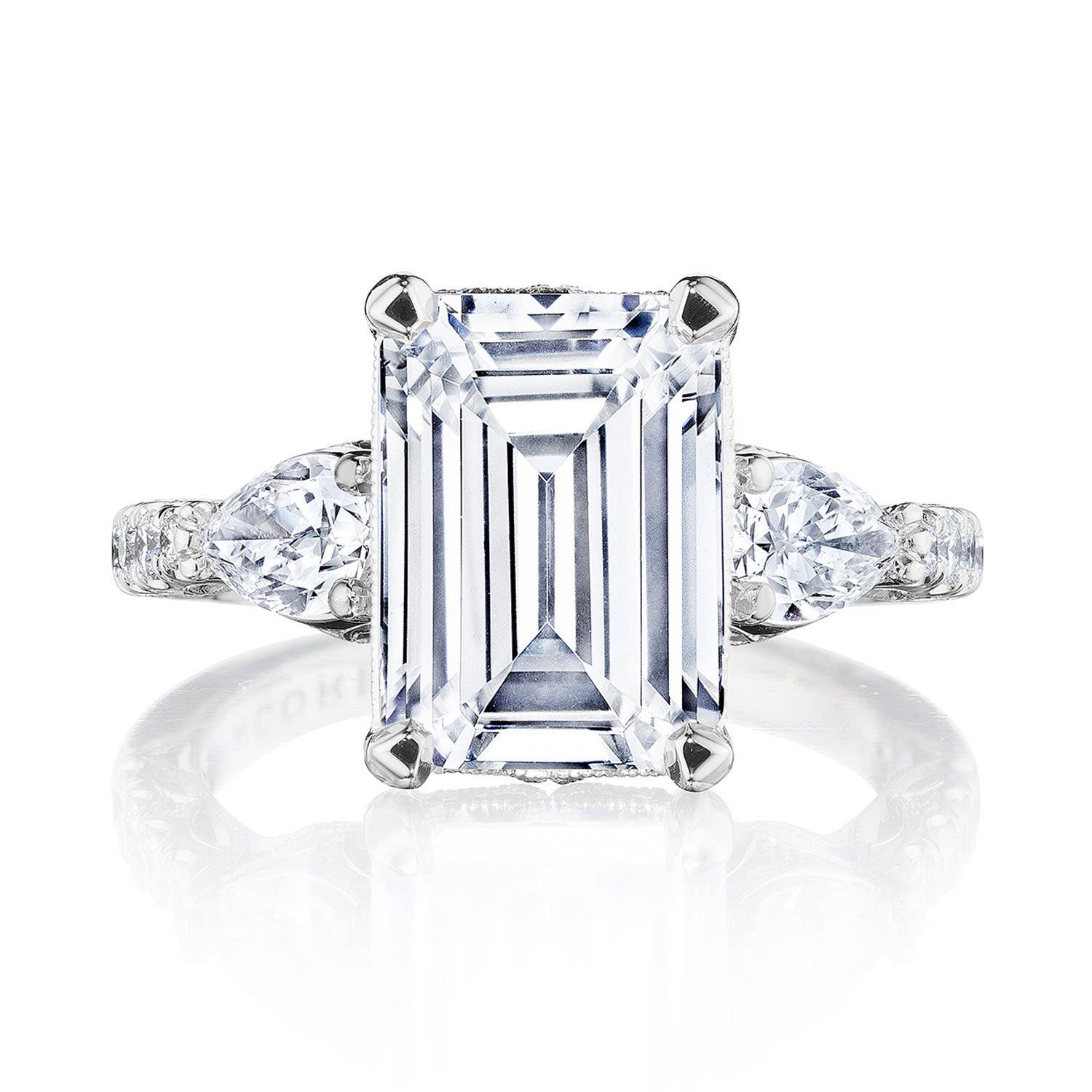 This three stone ring features distinctive pear side stones that sit atop a lace-like crown and foundation of complex, milgrain-edged Dantela Crescent Fabric. Meticulous, hand-set French pavé leads up the ceiling for eye-catching brilliance.
