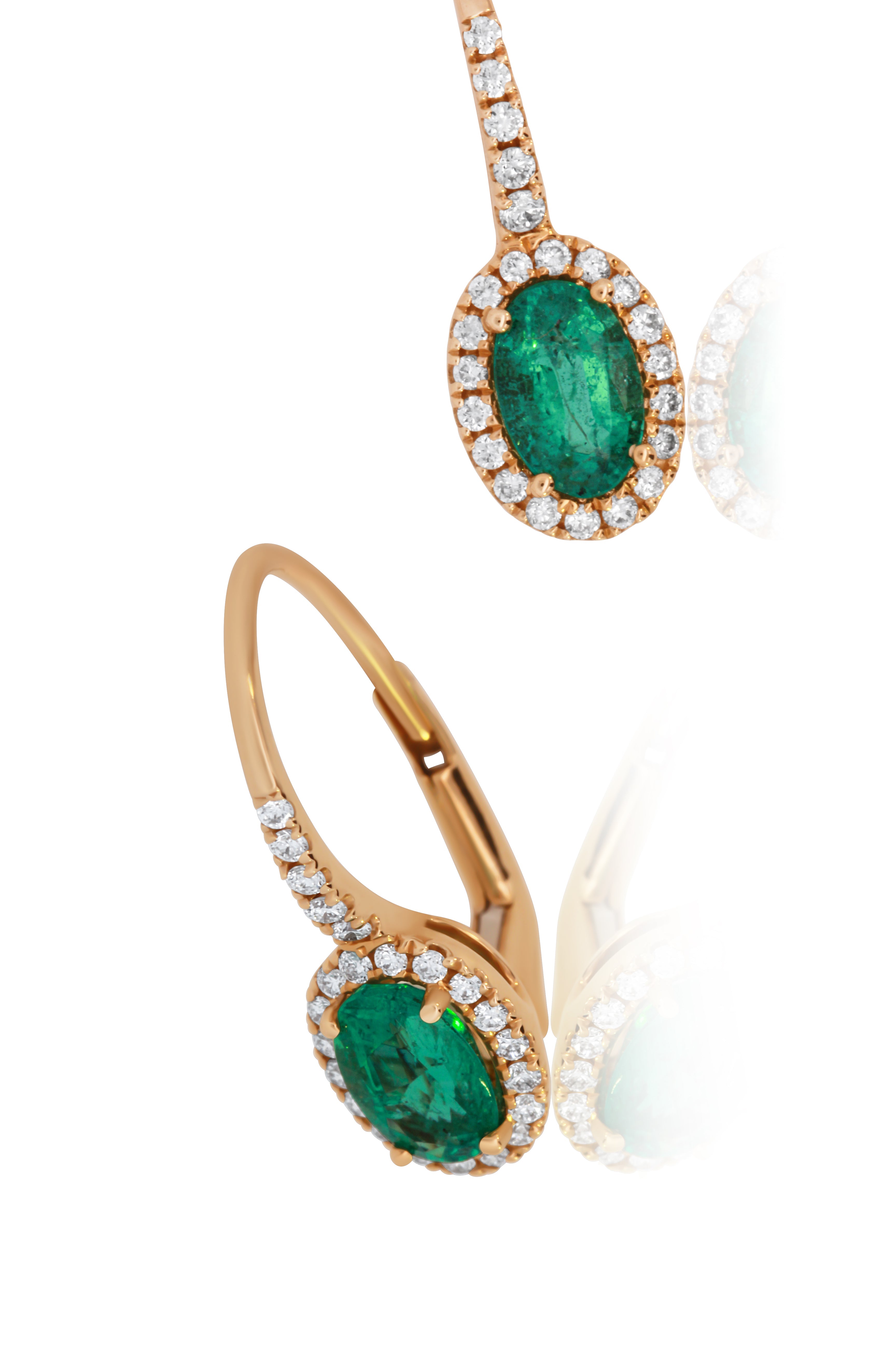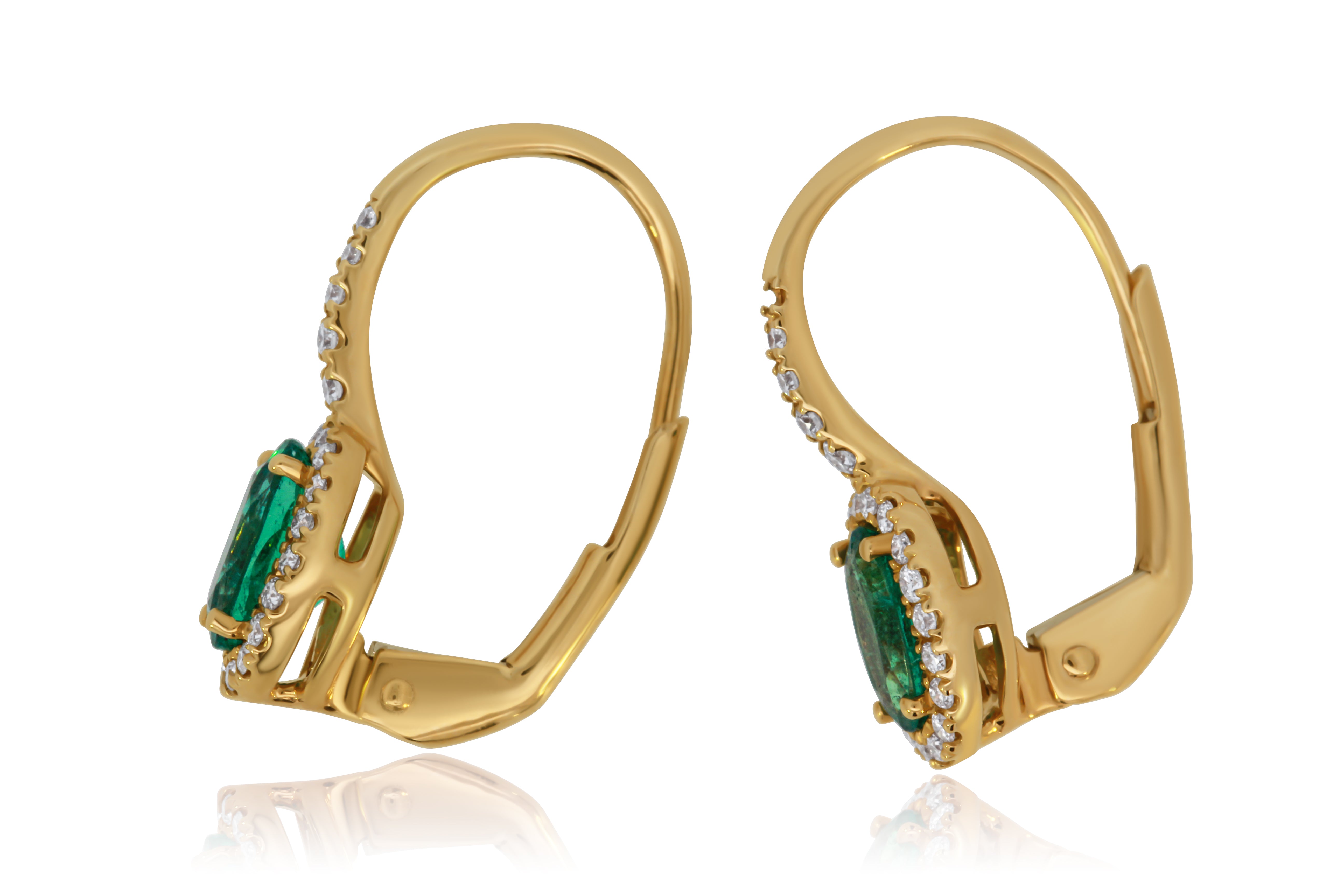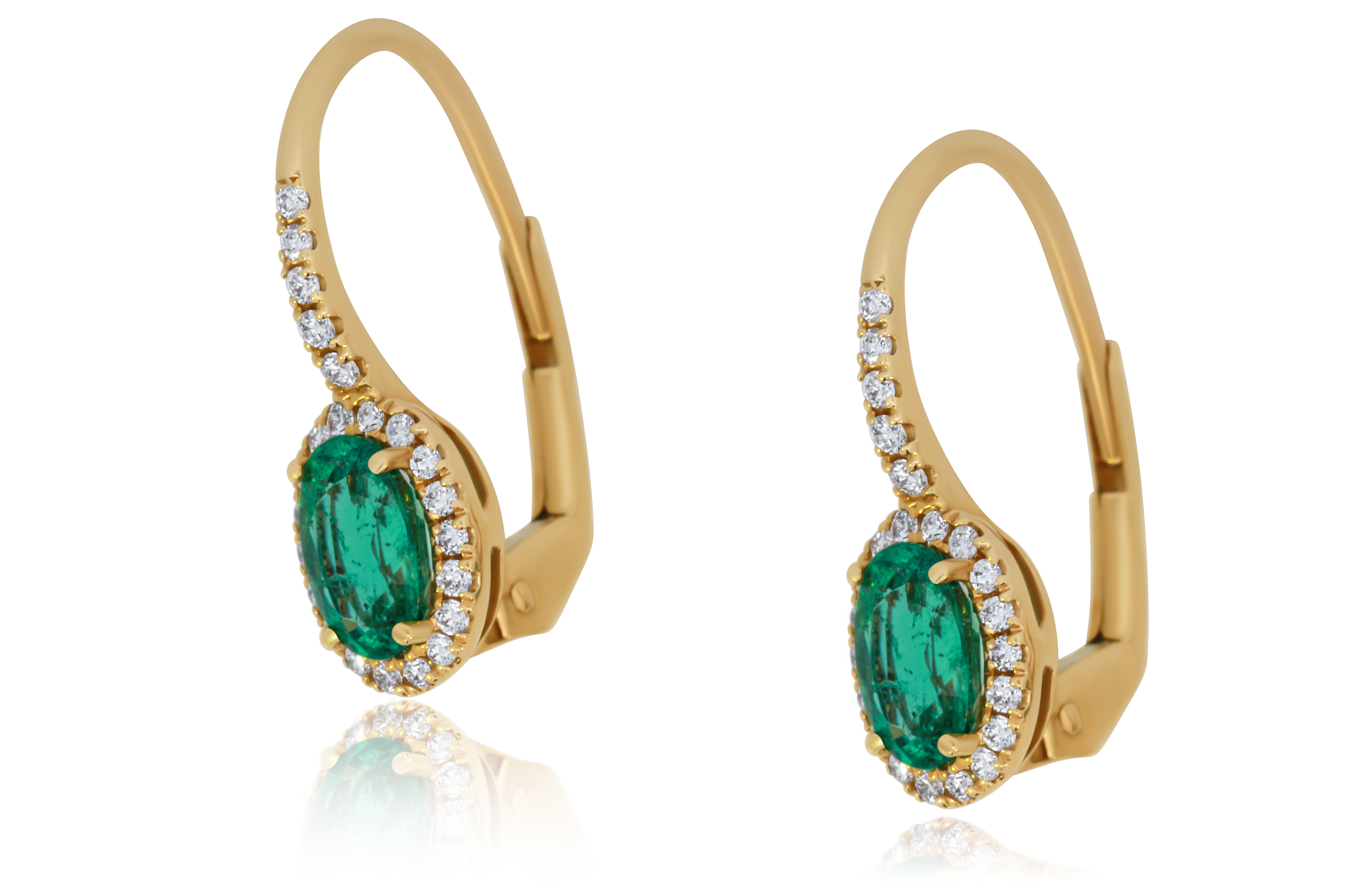 14KT yellow gold drop earrings feature two vivid oval-cut emeralds totaling 0.79 carats, framed in a graceful halo of 0.14 carats total weight of sparkling round diamonds. The diamonds continue along the elongated lever-back design, creating a refined curve that enhances the natural brilliance of each stone.