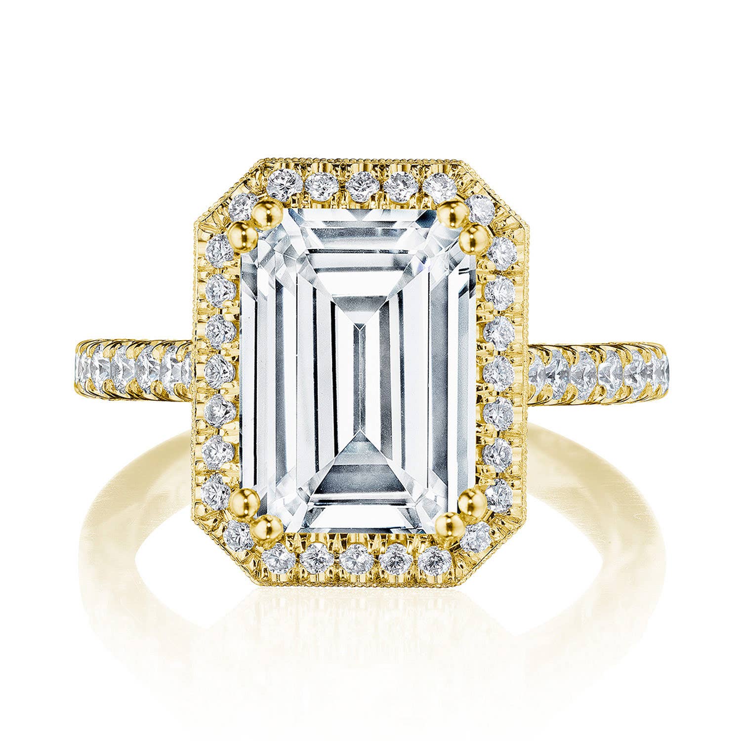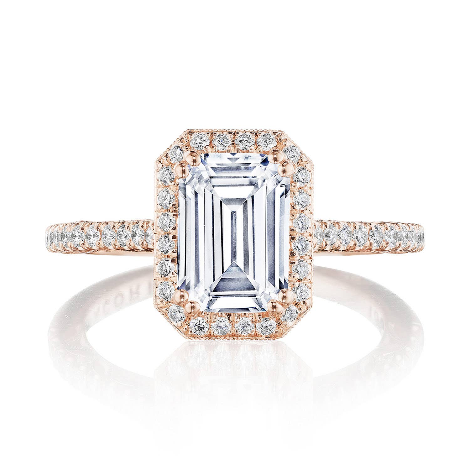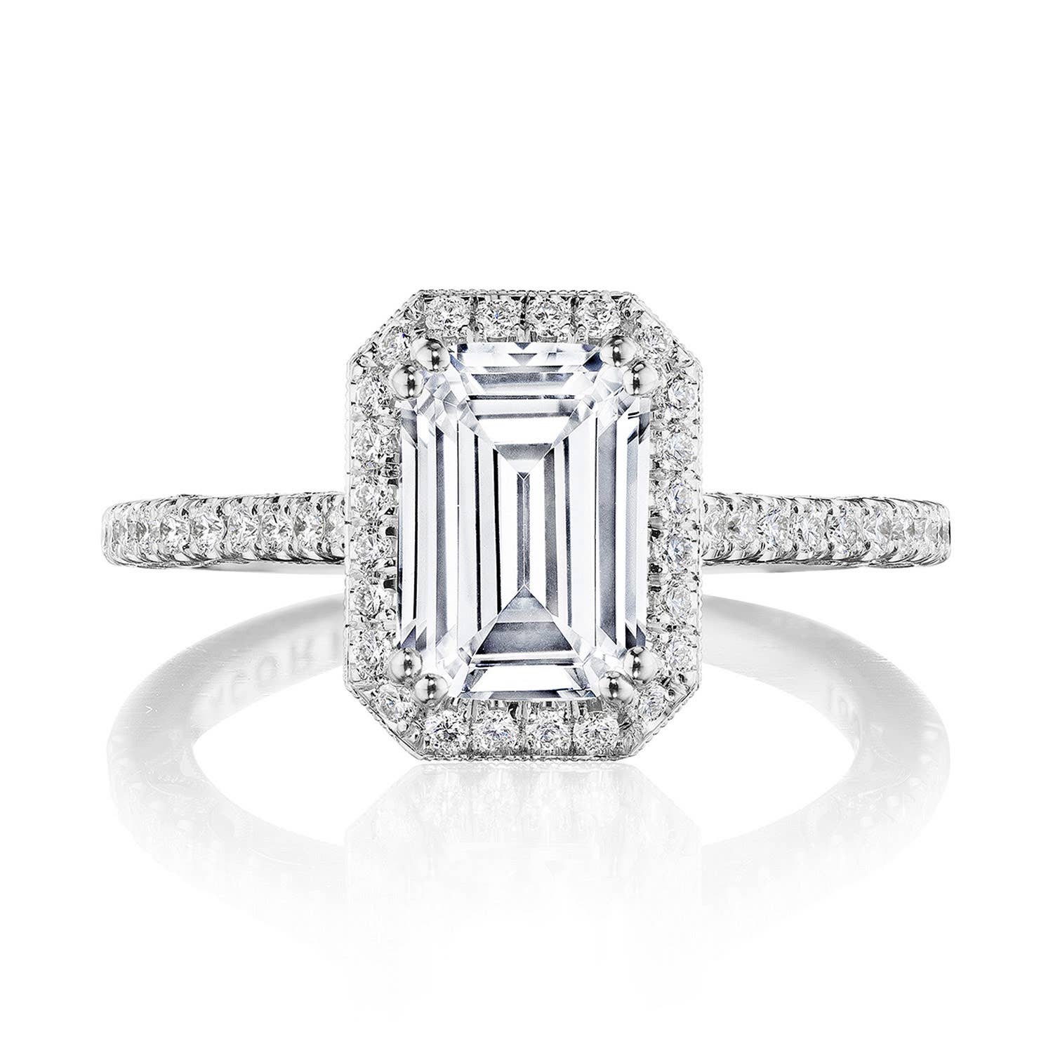 A subtle Spotlight Bloom encircles the center stone, and more brilliance is added by the meticulous French pavé that leads up the ceiling. A lace-like Crescent Fabric, edged with milgrain, gives stunning texture to the inner face profile.