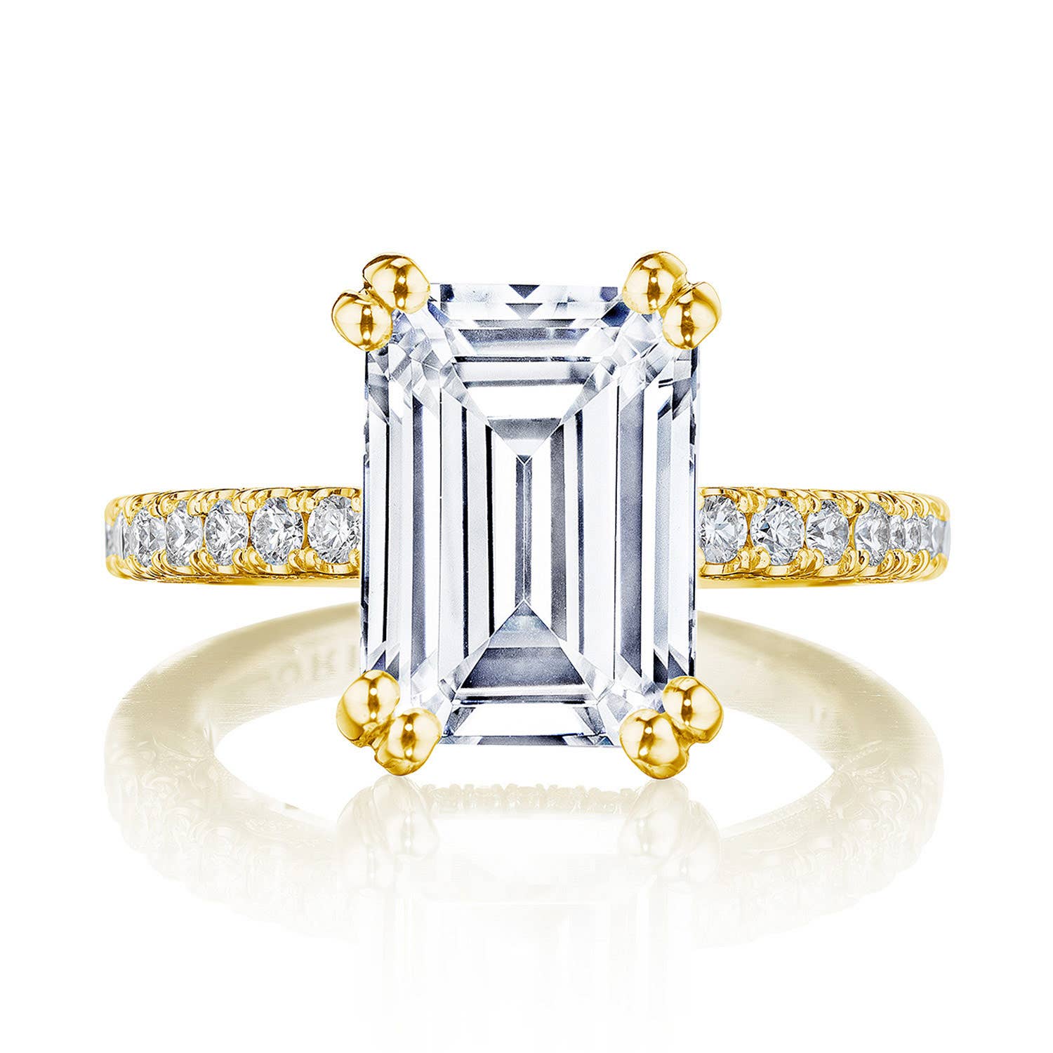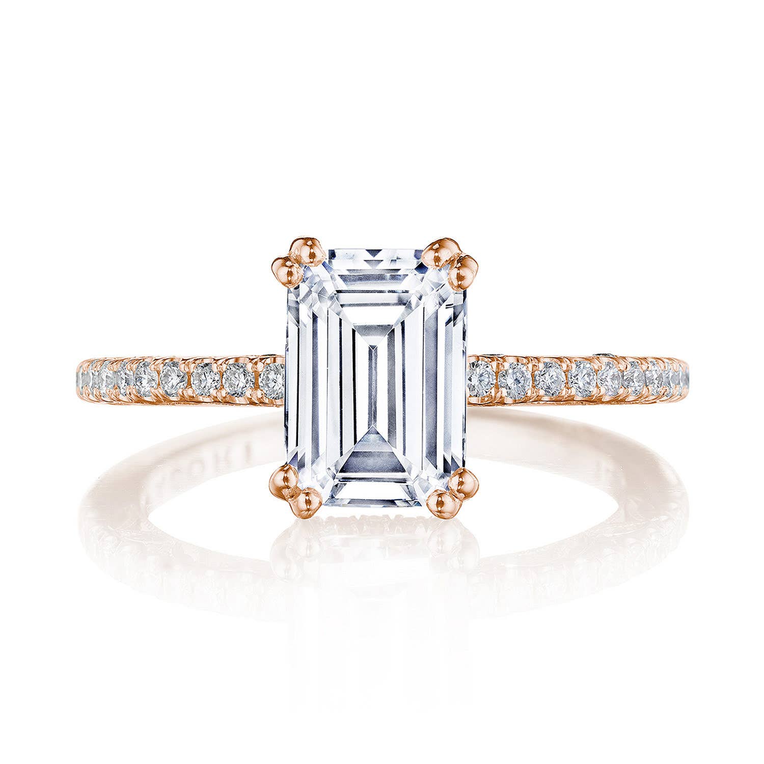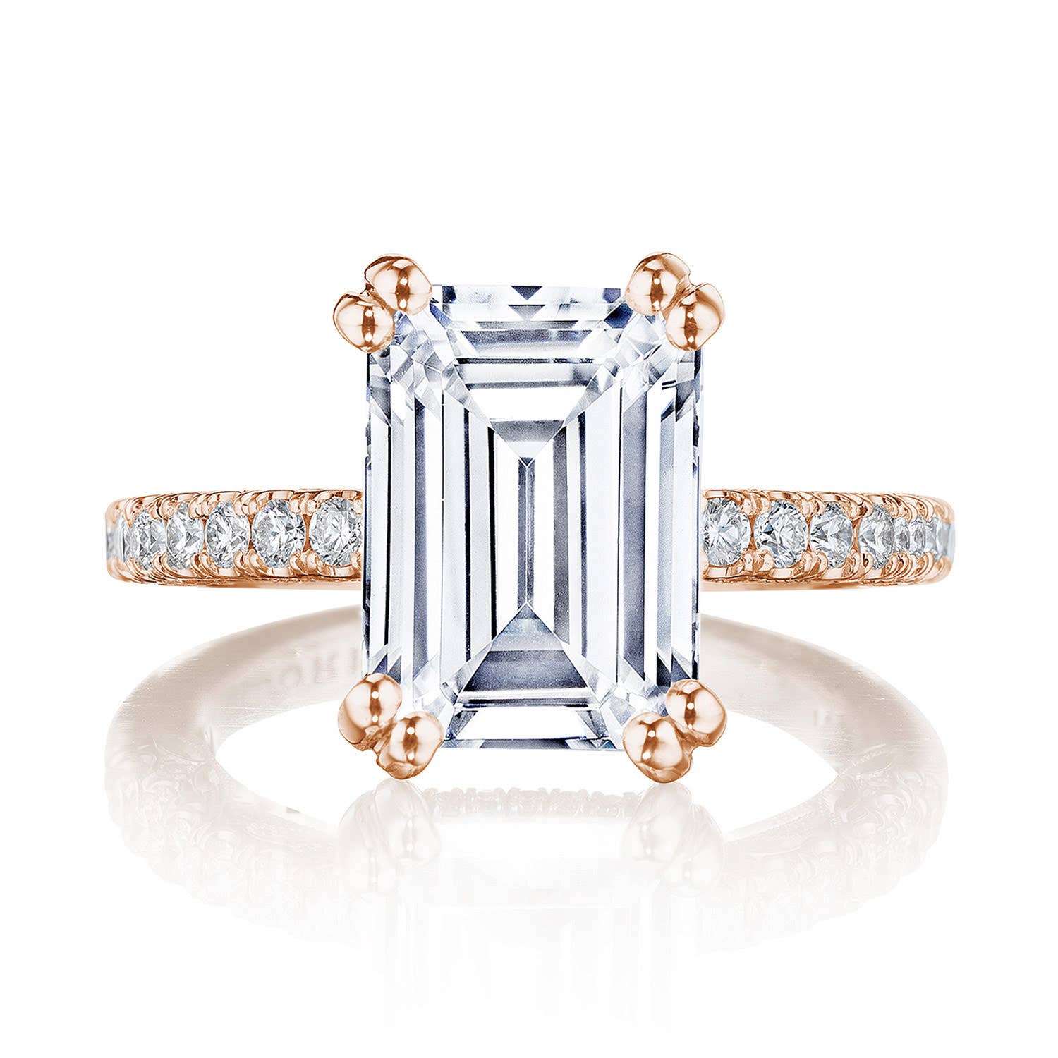 A French pavé ceiling adds dimensional light, while a hidden bloom and open air crown work illuminates the center stone. A complex and alluring lace-like Crescent Fabric gives stunning texture to the inner face profile.
