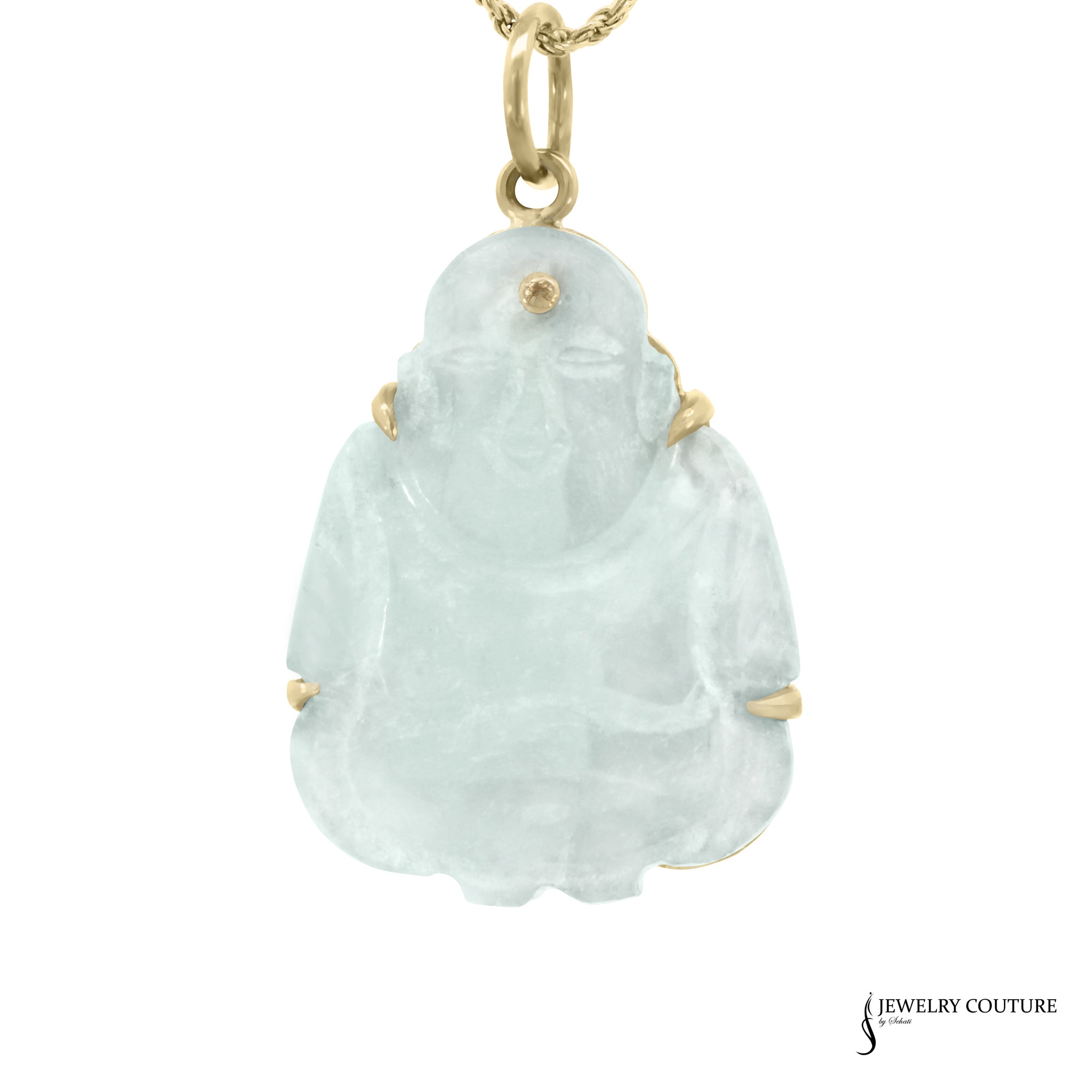 Crafted with 18KT yellow gold, this pendant features a beautifully carved Jadeite Buddha, adding a serene and spiritual element to your look.
