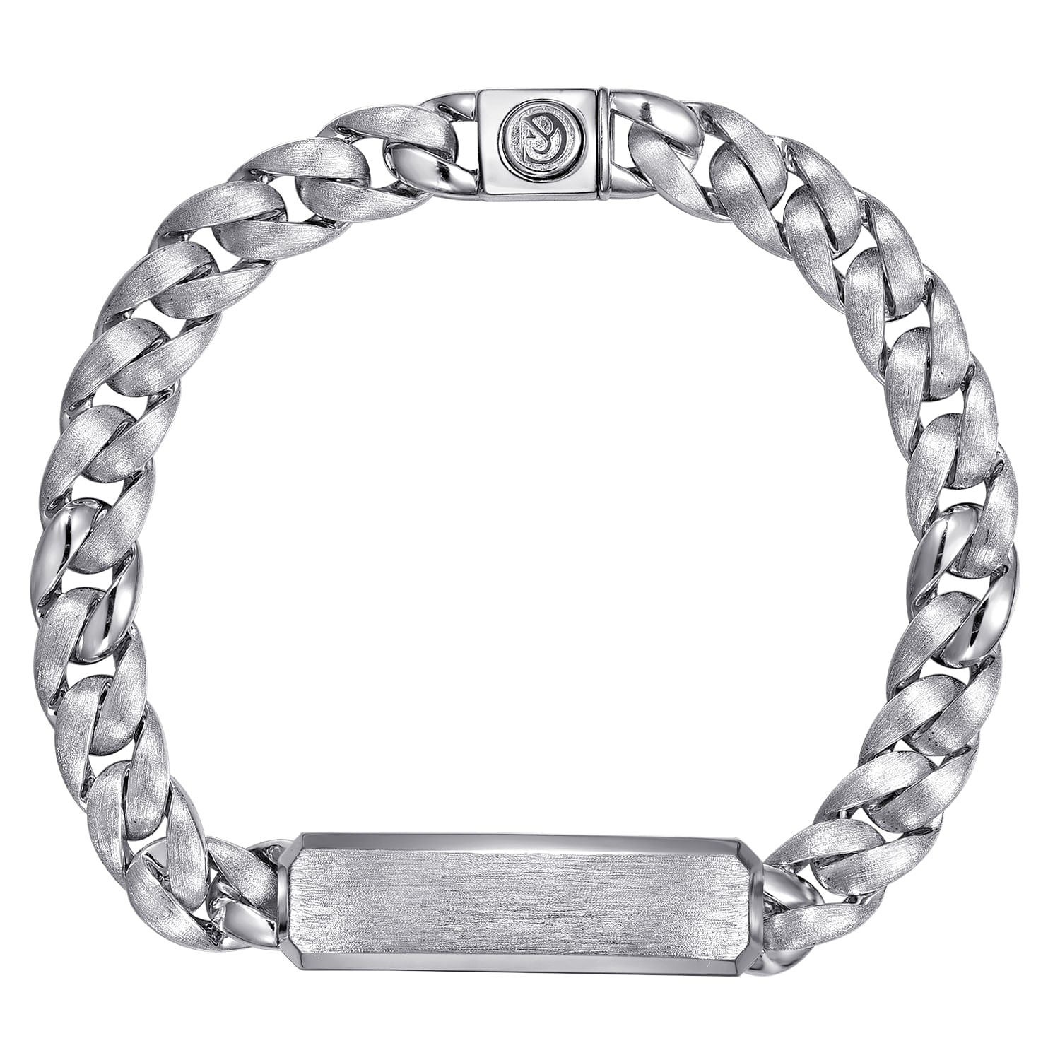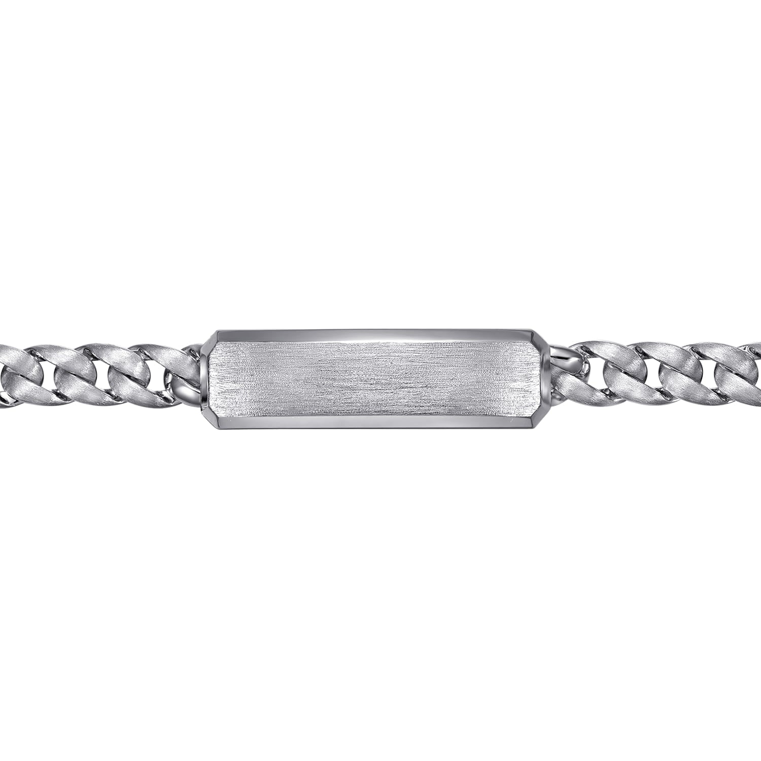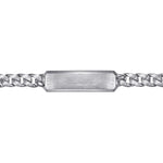 Crafted in brushed sterling silver, this Cuban link bracelet features an engravable ID plate framed by solid interlocking links. A rectangular clasp with an emblem detail completes the look.