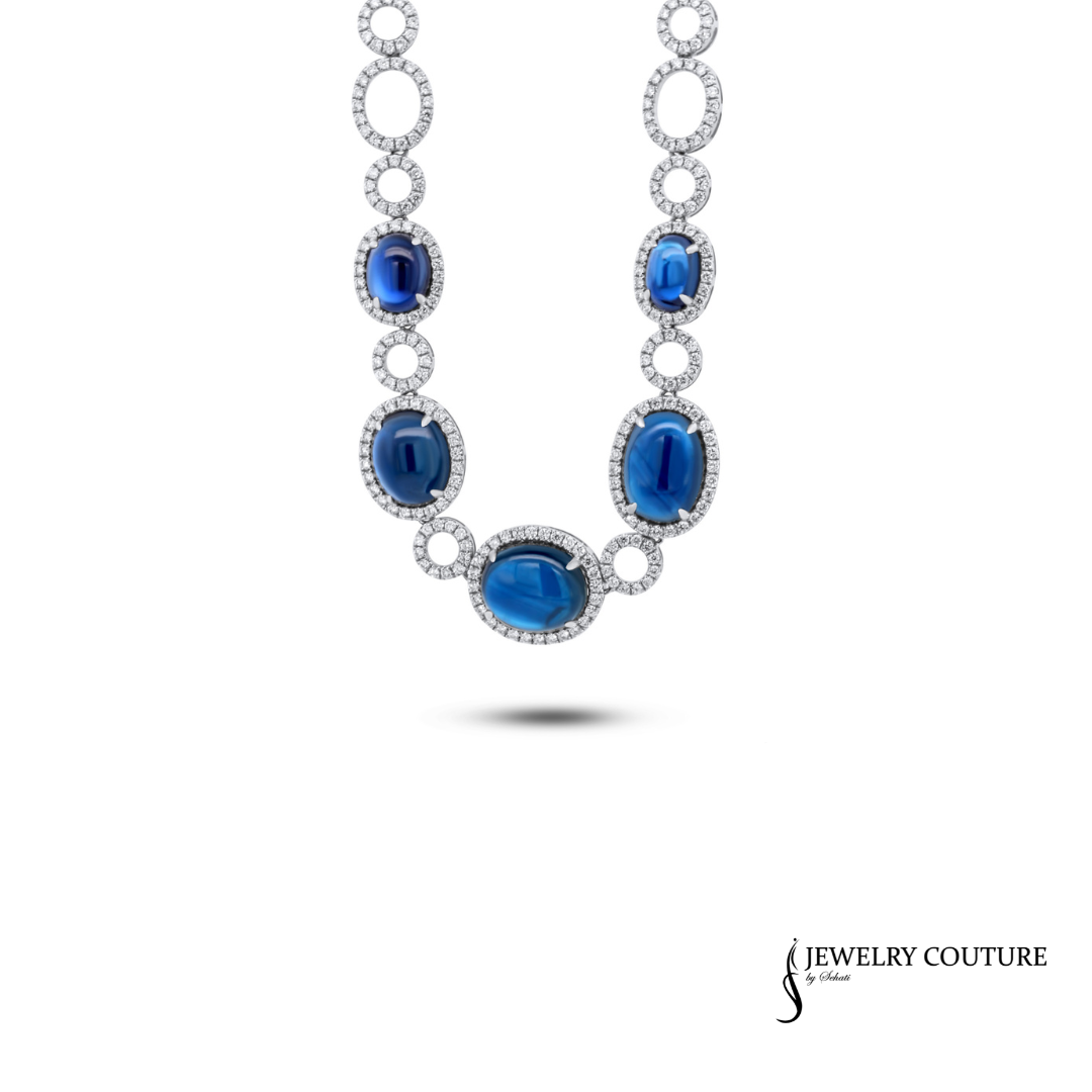 This 18KT white gold necklace features a stunning 34.07 carat blue cabochon sapphire, accented by a total diamond weight of 2.91 carats. Crafted with expert precision, this necklace is sure to make a statement piece for any special occasion.