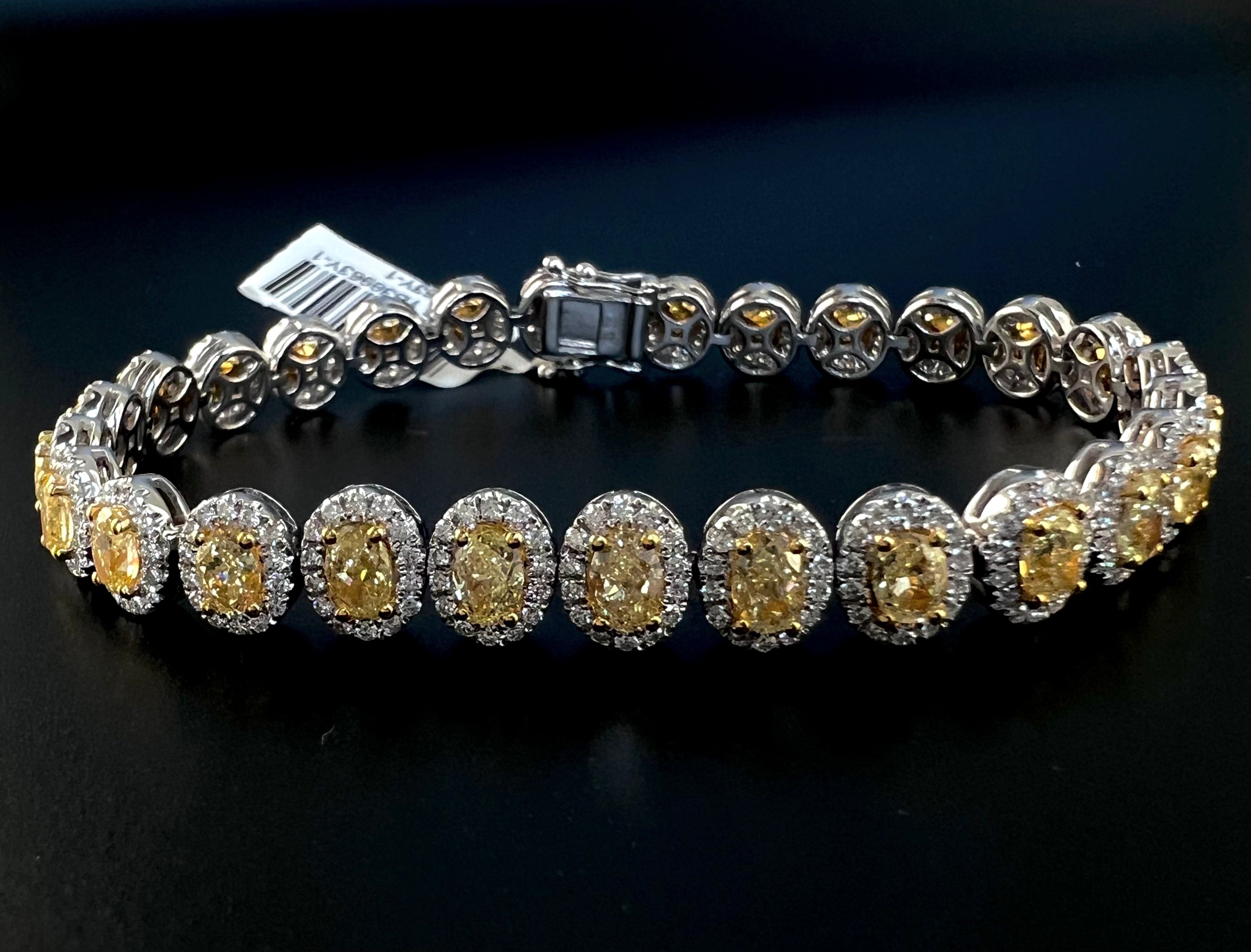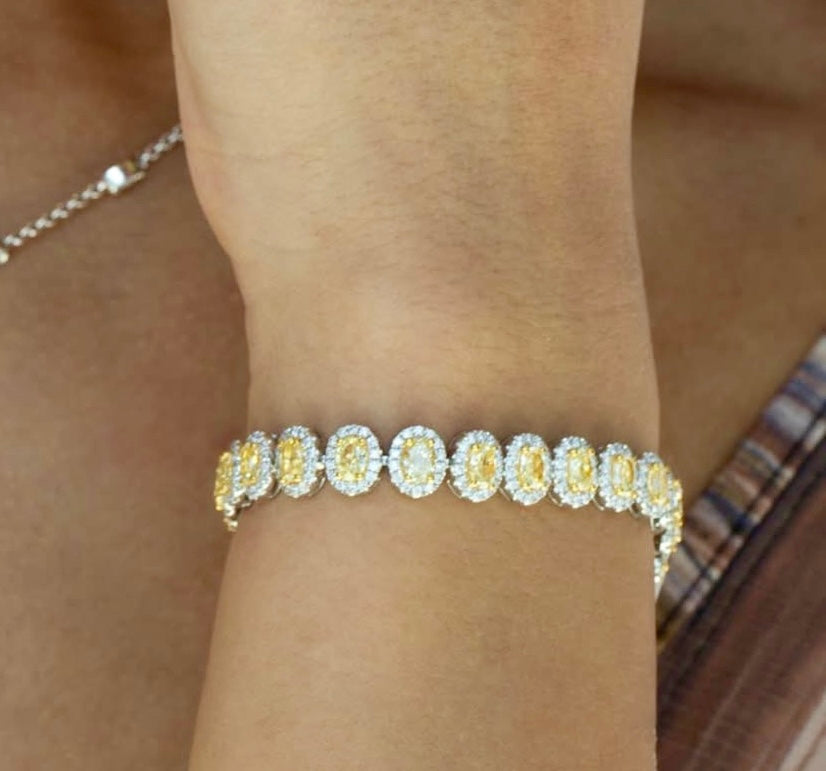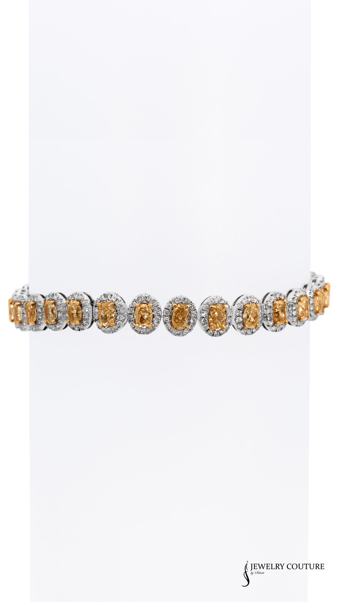 Featuring 7.95CT of radiant yellow diamonds and a sparkling 2.35CT diamond halo, this exquisite bracelet is crafted from the finest 18KT white gold. Designed to captivate, it’s the ultimate statement piece for those who love timeless sophistication. Elevate your jewelry collection with this stunning masterpiece today.