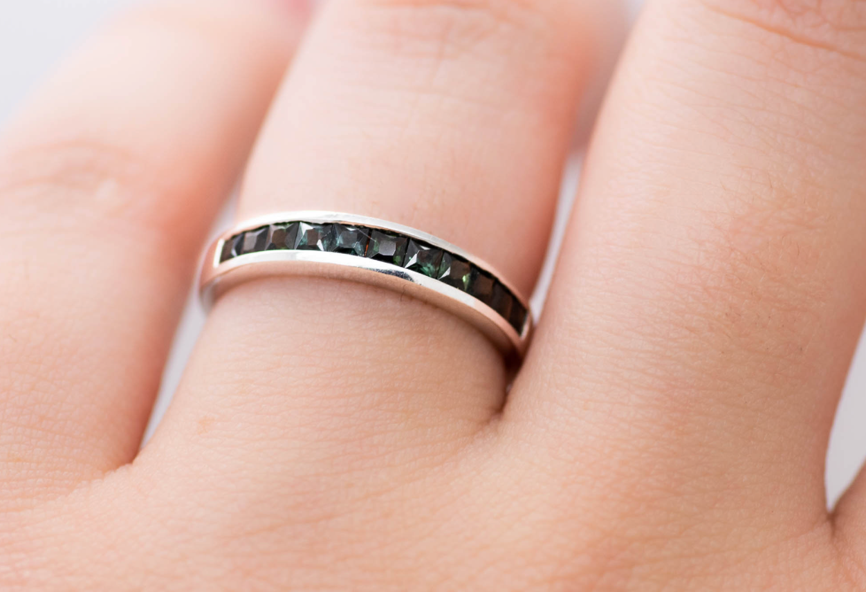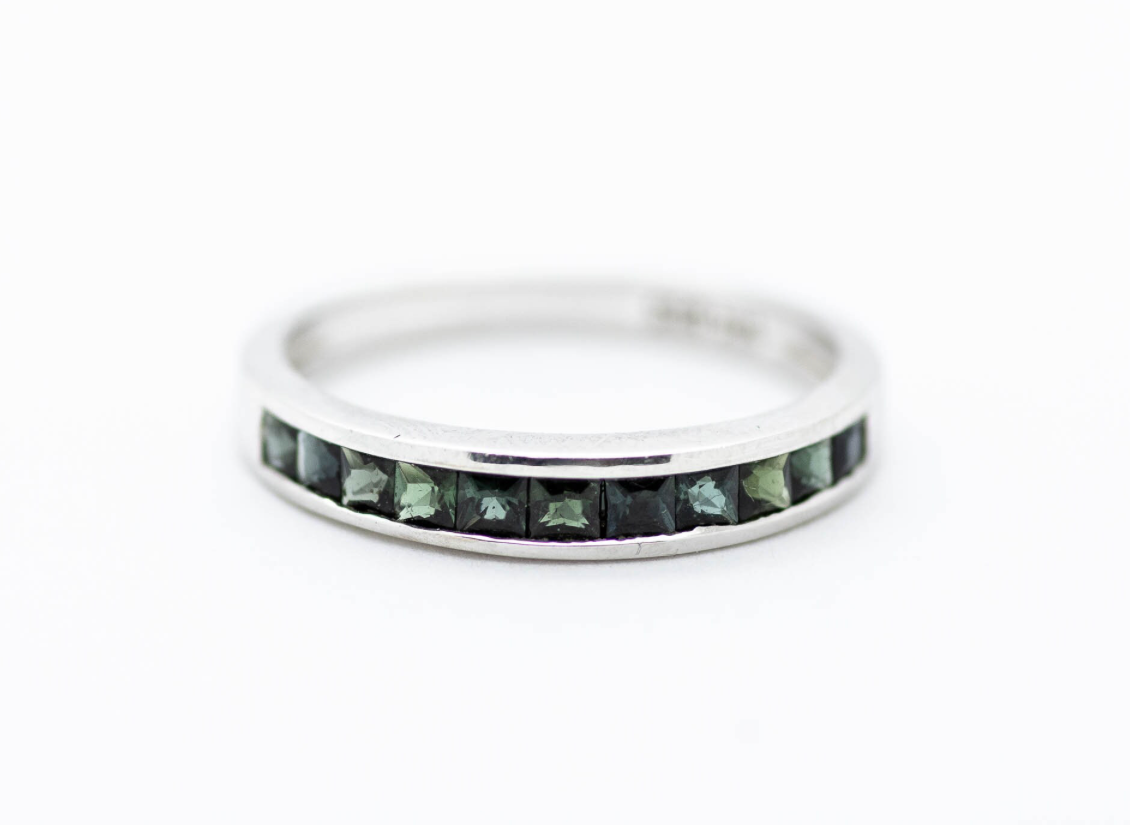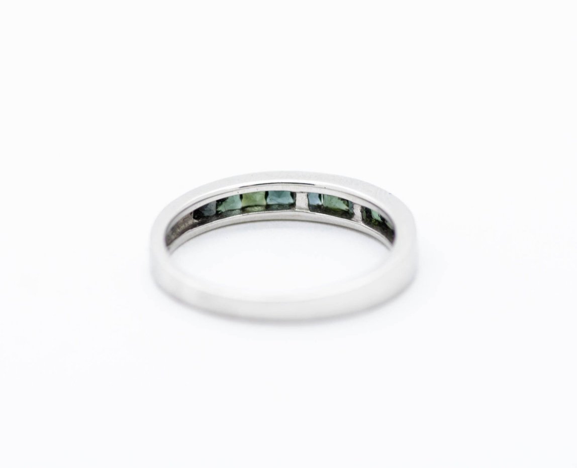 Dark green natural tourmaline stones channel set in a 14k white gold band. Simple and elegant, and perfect for any occasion.