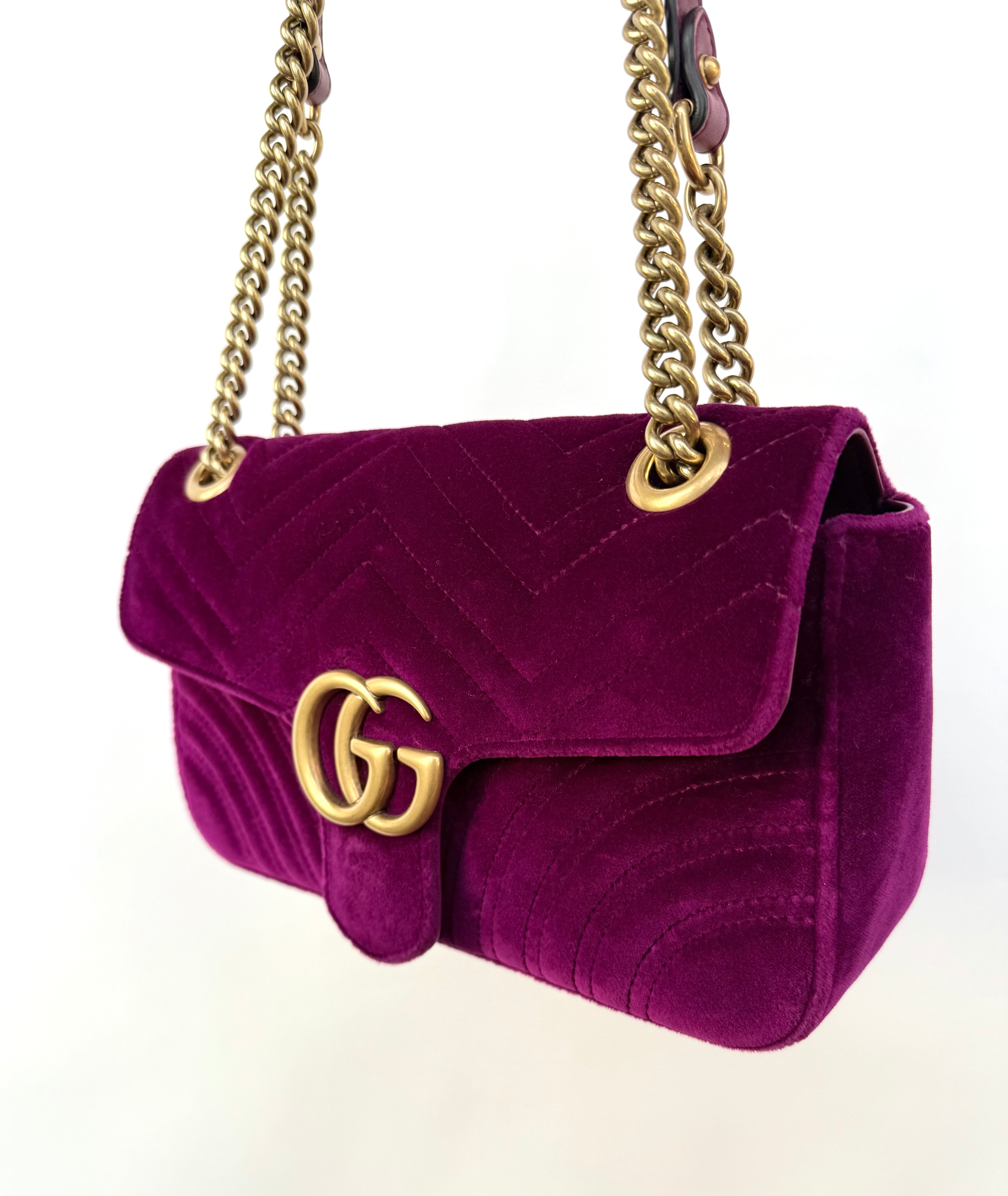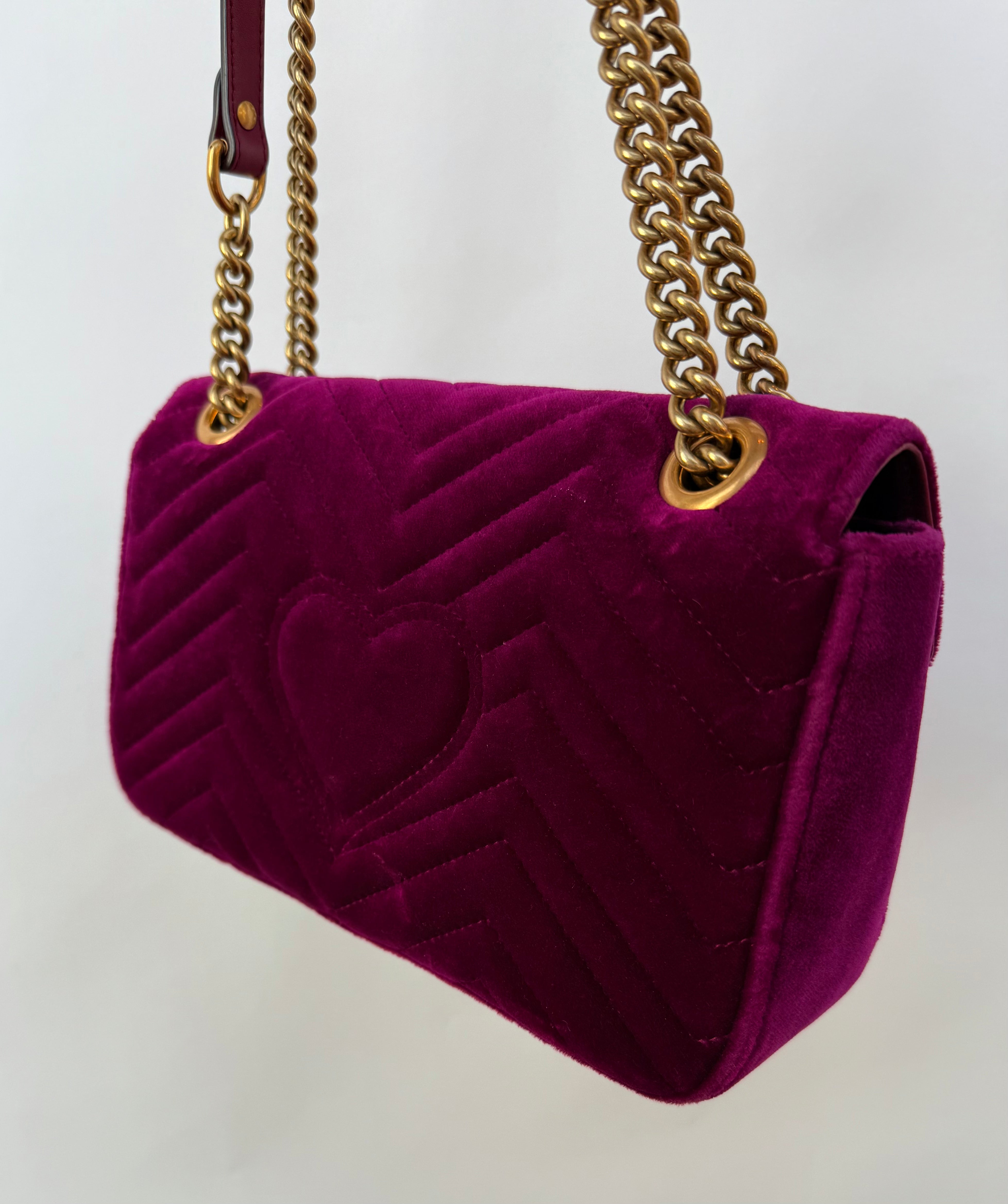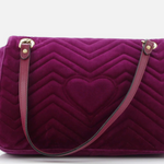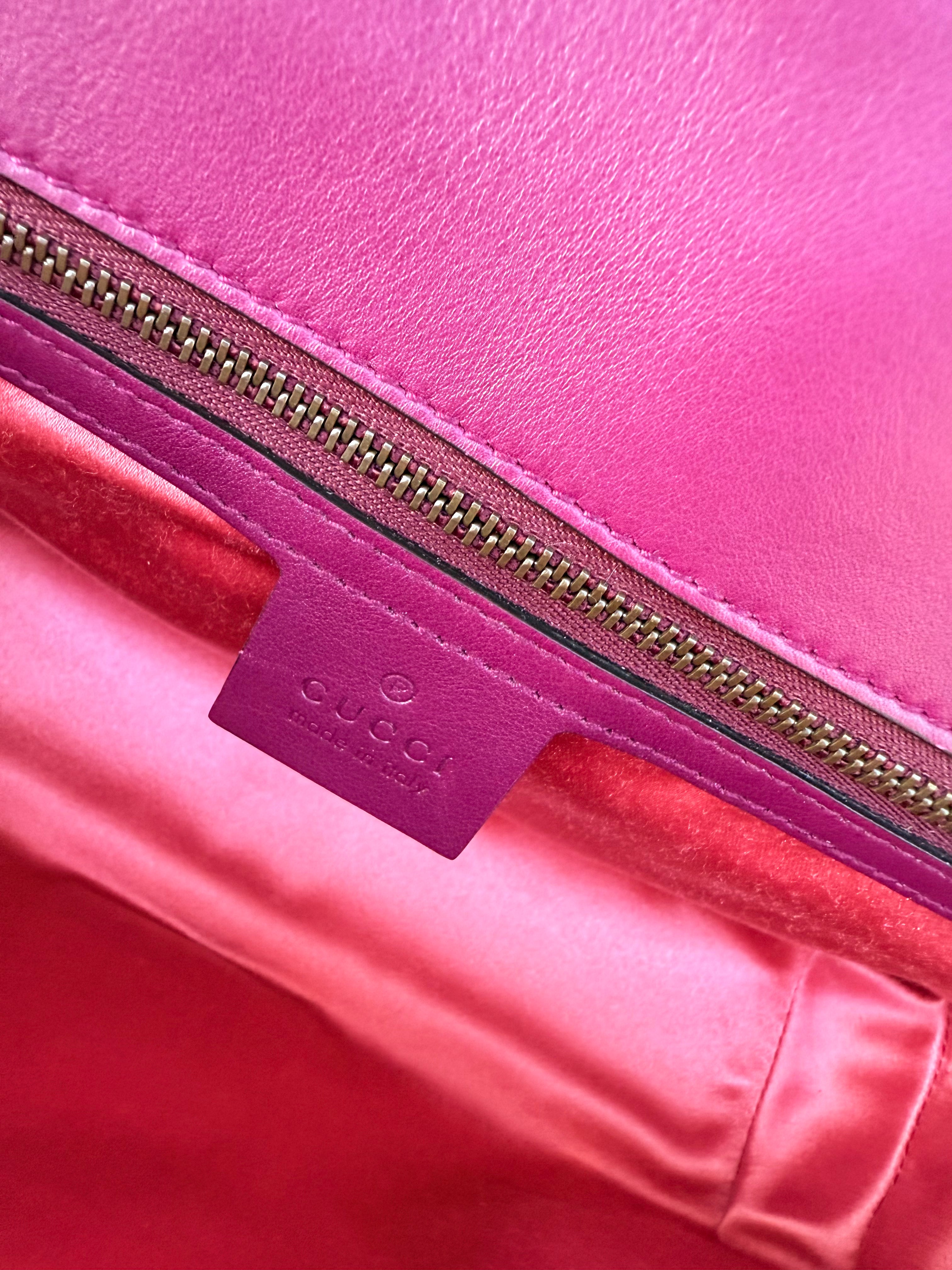 Features: Fuchsia matelassé chevron velvet exterior with stitched heart on the back; antiqued gold tone hardware including GG logo, sliding chain shoulder strap with leather component; top flap with push lock closure; salmon pink satin lined interior with 1 x zip pocket.