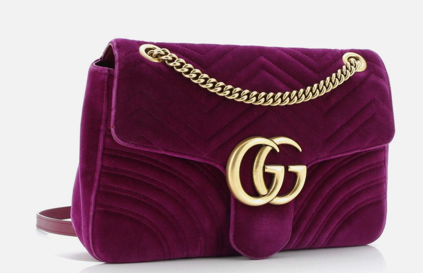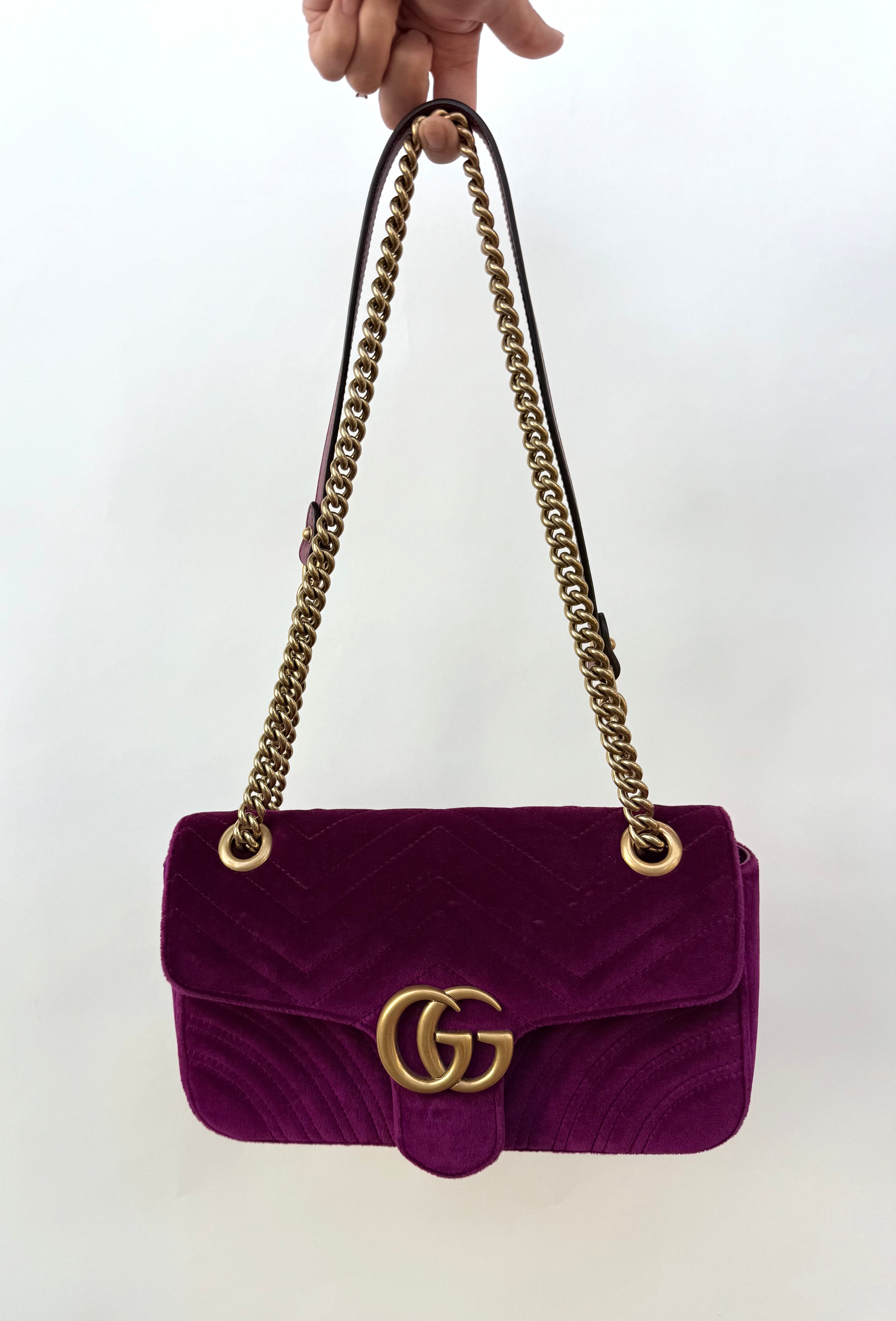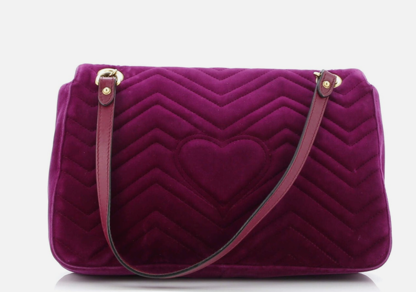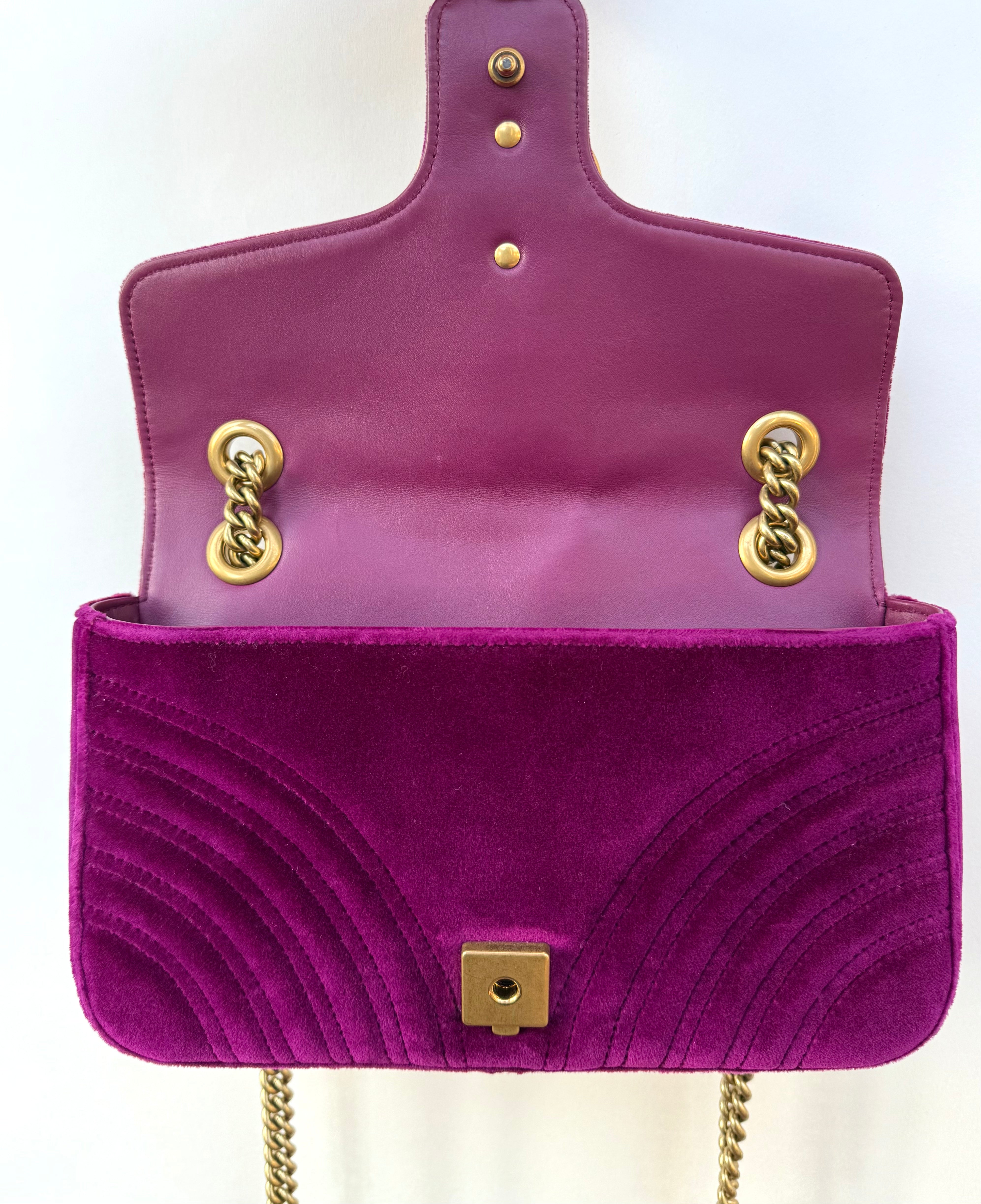 Features: Fuchsia matelassé chevron velvet exterior with stitched heart on the back; antiqued gold tone hardware including GG logo, sliding chain shoulder strap with leather component; top flap with push lock closure; salmon pink satin lined interior with 1 x zip pocket.
