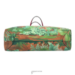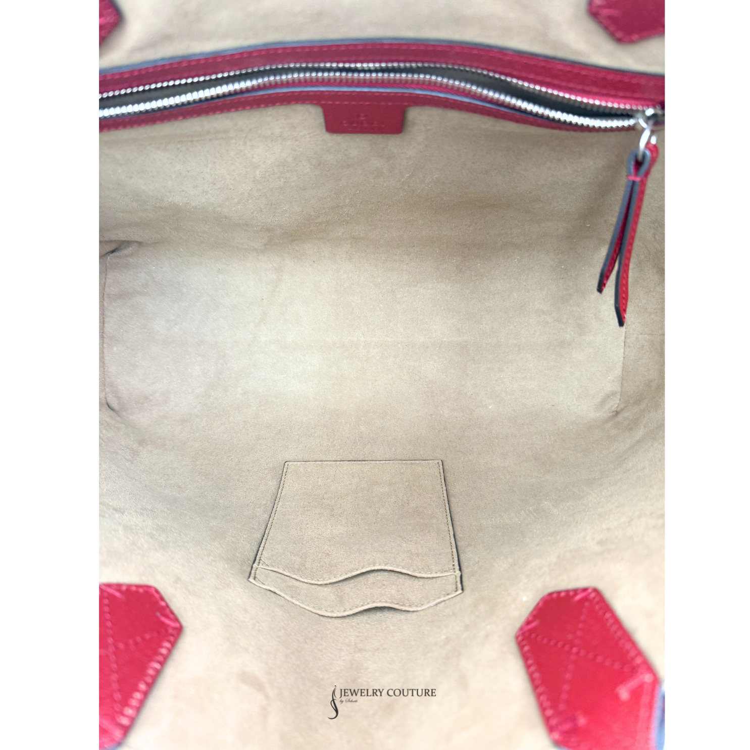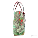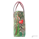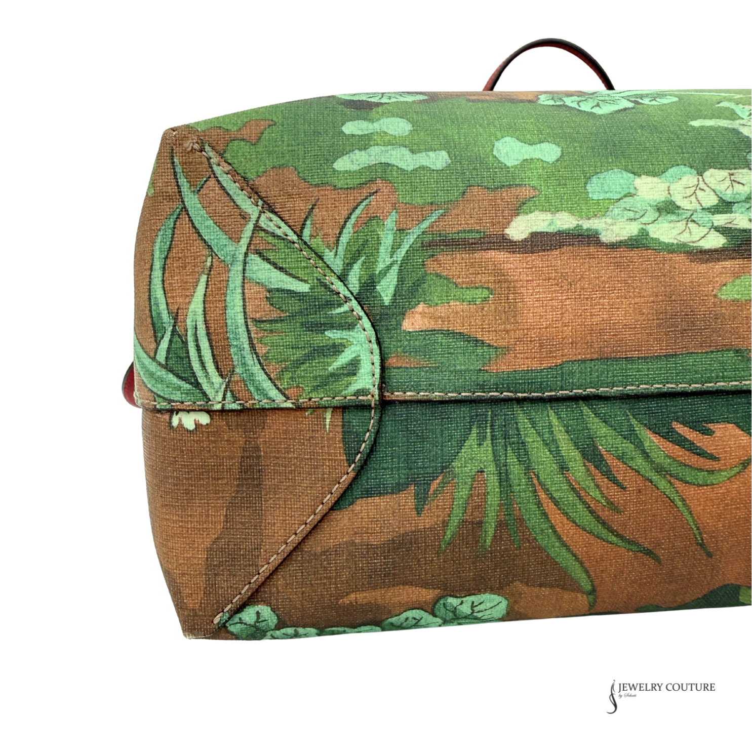 This is an authentic GUCCI GG Supreme Monogram Medium Tian Print Tote in Red. This chic tote is crafted of signature GG Supreme canvas printed with contemporary birds and greenery. The tote features red calfskin leather shoulder straps and a broad open top that reveals a spacious dark beige suede interior with zipper and patch pockets.