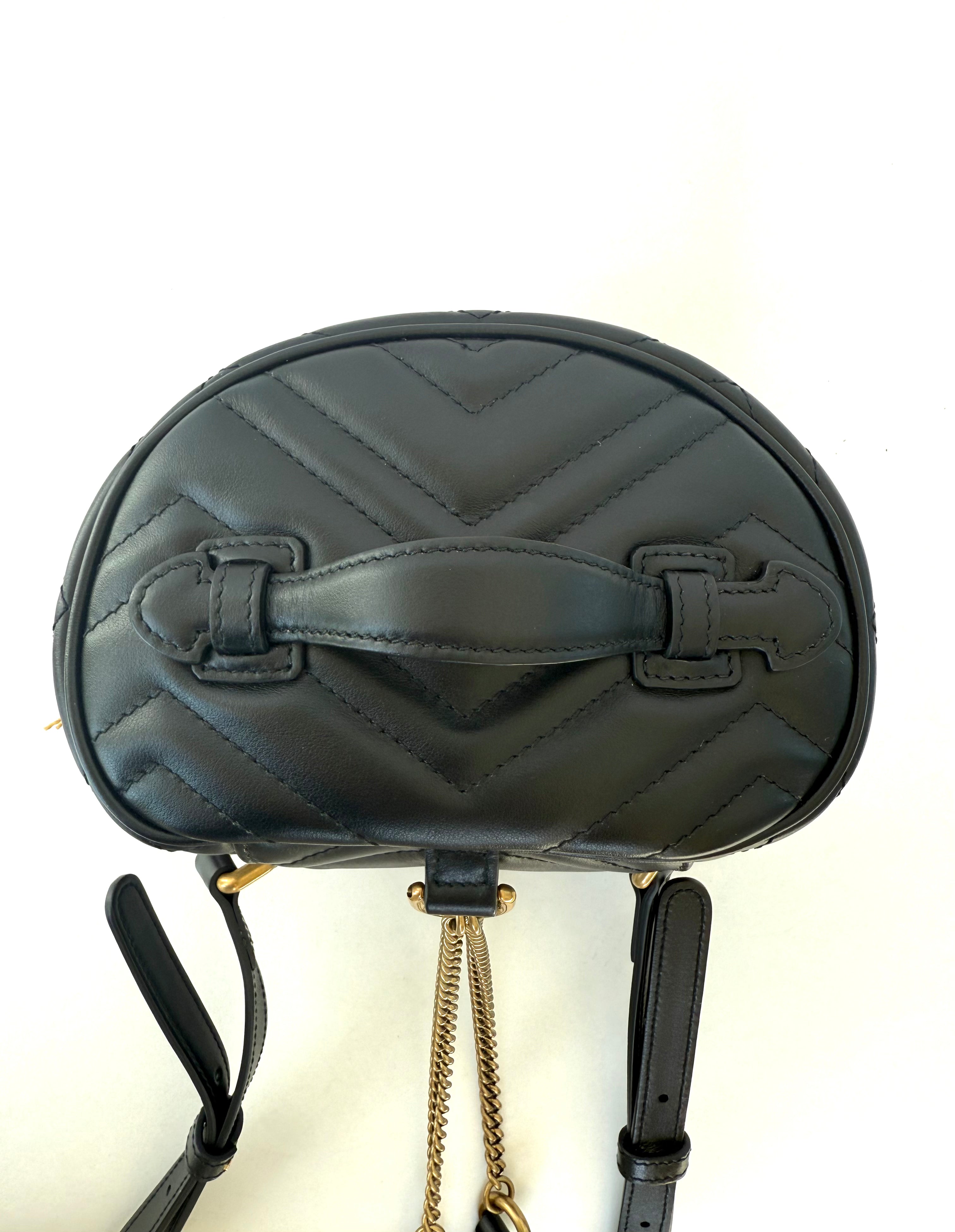 New authentic GUCCI Calfskin Matelasse GG Marmont Mini Backpack in black. This backpack is crafted of chevron-quilted calfskin leather in black. The backpack features a leather strap top handle, adjustable shoulder straps, and an aged gold interlocking GG logo on the front. The wrap-around zippers open to a beige microfiber interior.