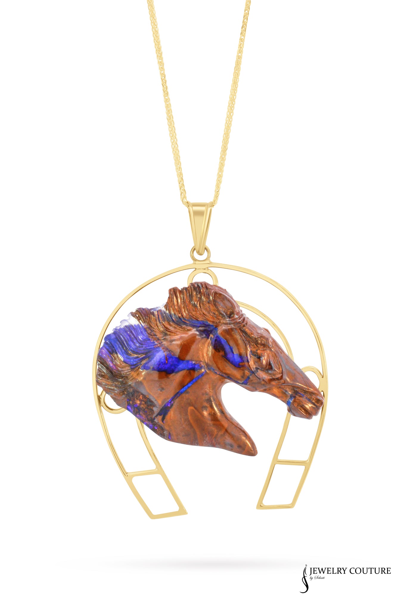 This stunning 14KT Yellow Gold Boulder Opal Horse Pendant is a symbol of beauty and strength. The intricately designed horse with a lucky horseshoe is crafted with genuine boulder opal, making it a unique piece. Perfect for any horse lover, this pendant is a timeless addition to any collection.