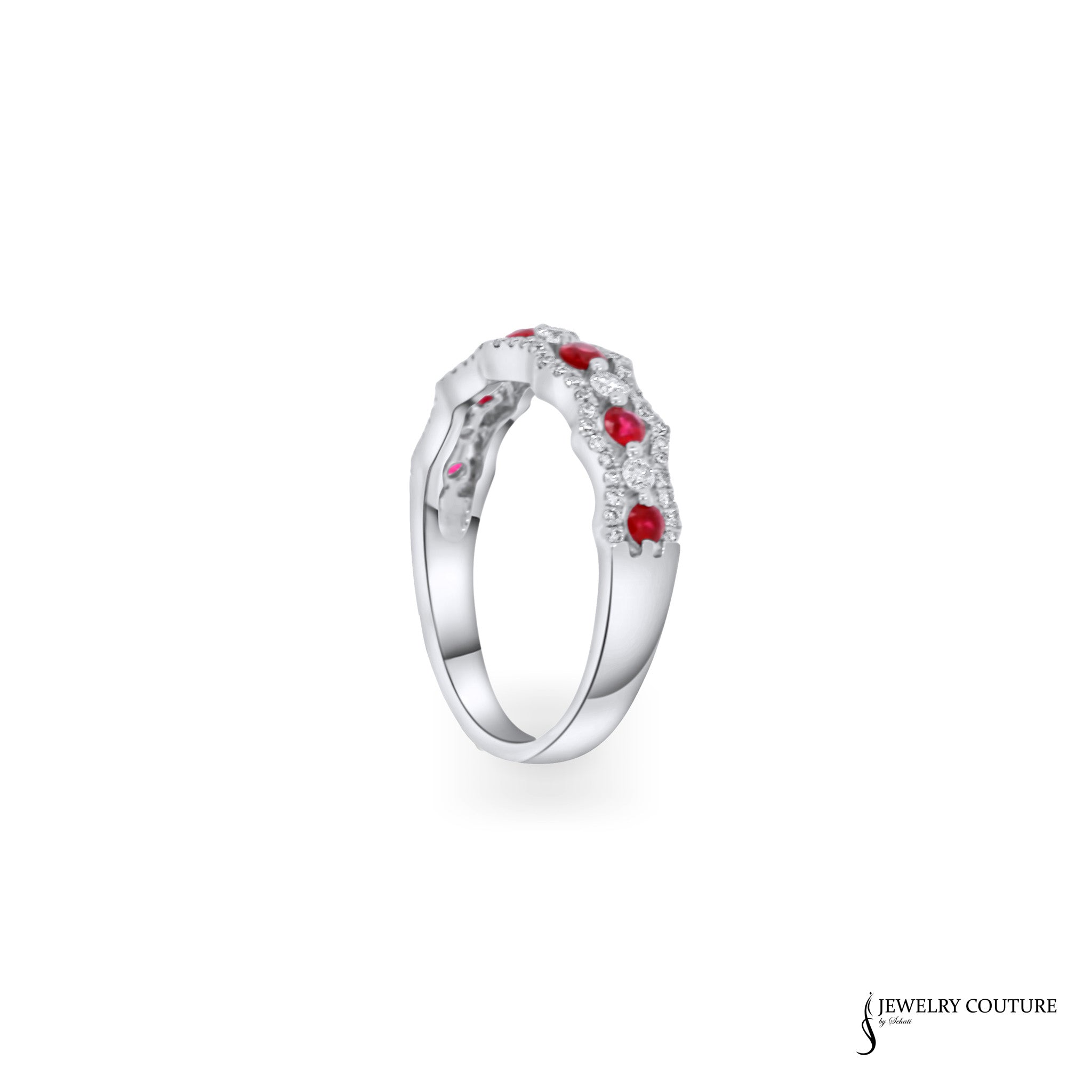 This 14KT white gold ring boasts 63 round diamonds, totaling 0.32CT, and 6 round cut ruby stones, totaling 0.34CT. Expertly crafted, this ring sparkles with both diamonds and rubies, making it a stunning addition to any jewelry collection. Elevate your style with this elegant and timeless piece.
