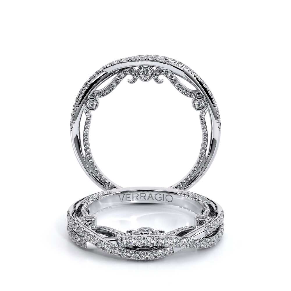 INSIGNIA-7070W diamond wedding ring from the Insignia Collection featuring round brilliant-cut diamonds pave set on a twisted band. Unique with bezel set diamonds with distinguishing Insignia Scrollwork accompanied by Verragio's timeless signature beadin