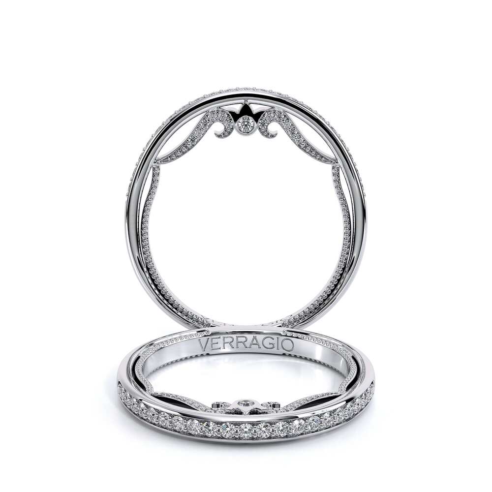INSIGNIA-7094W diamond wedding ring from the Insignia Collection. Featuring round brilliant-cut diamonds channel set on a straight band. Distinctive diamond Insignia Scrollwork accompanied by Verragio's signature crest and beading.