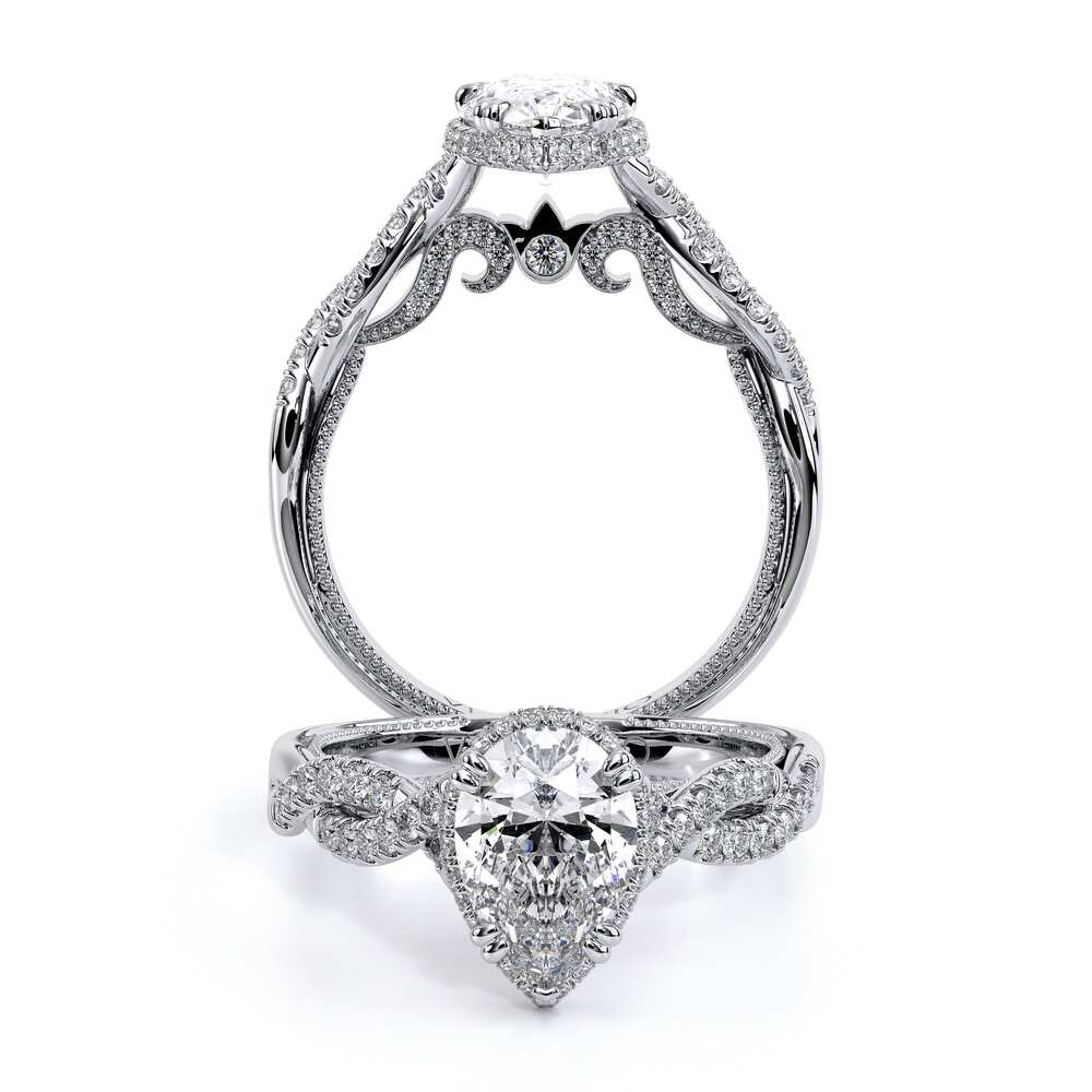 INSIGNIA-7099PS Pear engagement ring featuring Verragio's handcrafted stardust halo adorned with meticulously set round brilliant-cut diamonds atop a twisted band. Accompanying diamond Insignia scrollwork refined with Verragio's timeless signature crest a
