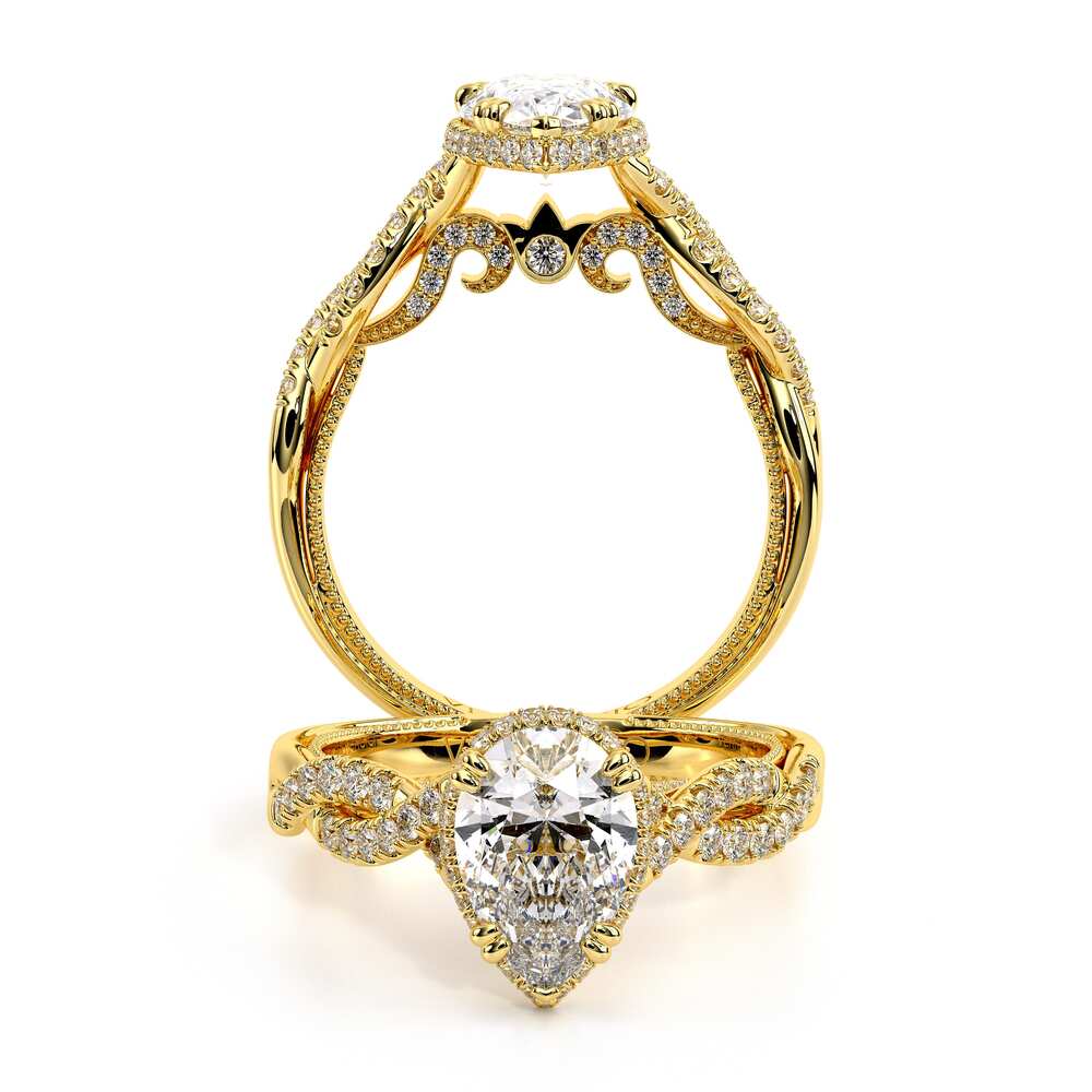 INSIGNIA-7099PS Pear engagement ring featuring Verragio's handcrafted stardust halo adorned with meticulously set round brilliant-cut diamonds atop a twisted band. Accompanying diamond Insignia scrollwork refined with Verragio's timeless signature crest a