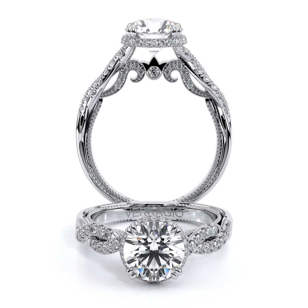INSIGNIA-7099R Diamond engagement ring featuring Verragio's handcrafted stardust halo adorned with meticulously set round brilliant-cut diamonds atop a twisted band. Accompanying diamond Insignia scrollwork refined with Verragio's timeless signature crest