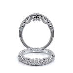INSIGNIA-7100W diamond wedding ring from the Insignia Collection featuring a shared-prong set band with round brilliant-cut diamonds. Distinguished by handcrafted diamond Insignia scrollwork amid Verragio's signature beading and crest.