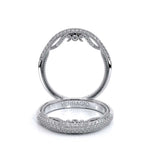 INSIGNIA-7104W diamond wedding ring from the Insignia Collection featuring round brilliant-cut diamonds pave set on a straight band. Adorned with handcrafted diamond Insignia scrollwork accompanied by Verragio's signature crest and beading.