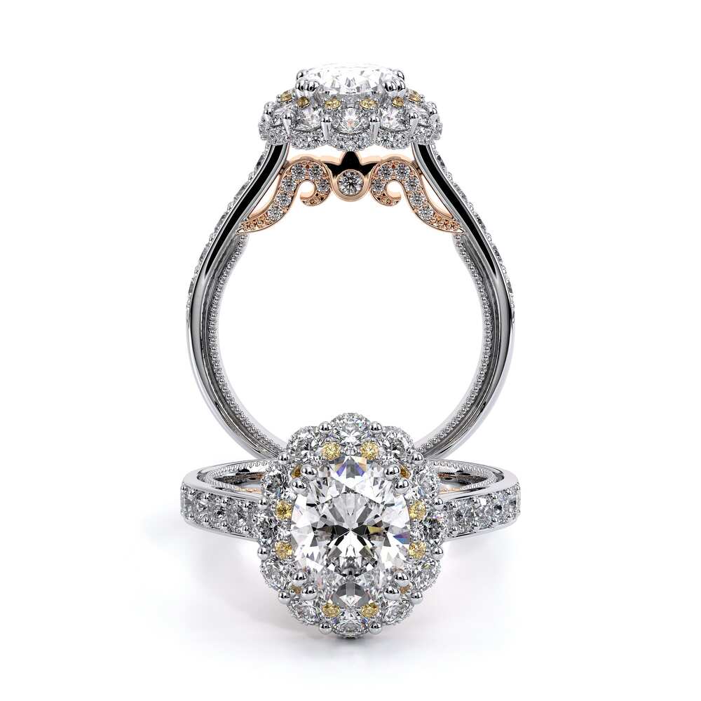 INSIGNIA-7106OV Features our prestigious Enchanted Diamond Halo creating a truly unique engagement ring designed to emphasize your oval diamond center. Verragio's timeless signature beading along side Insignia's handcrafted diamond scrollwork are all deta