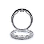 INSIGNIA-7107W diamond wedding ring from the Insignia Collection featuring round brilliant-cut diamonds channel set on a straight band. Adorned with handcrafted diamond Insignia scrollwork accompanied by Verragio's signature crest and beading.