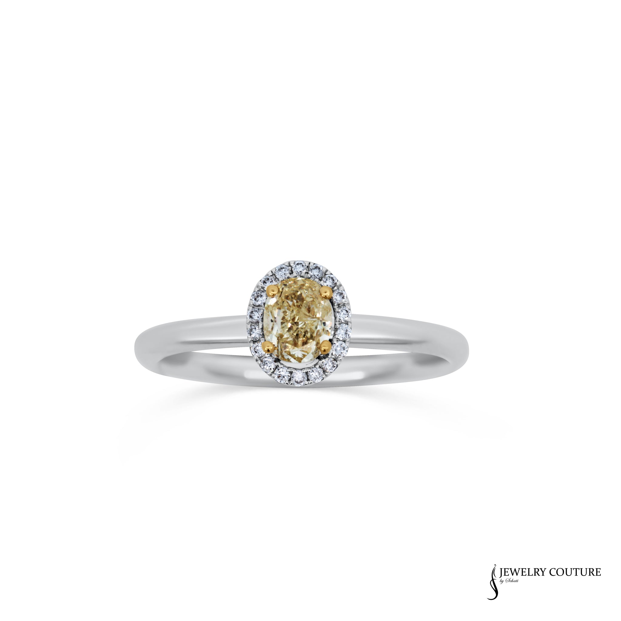 Enhance your style with the Jessamine stackable halo ring. Made from 14KT White Gold, this ring features a 0.41CT Yellow Oval Diamond surrounded by a 0.09CT Halo. The perfect combination of elegance and sophistication, this ring is perfect for any occasion.