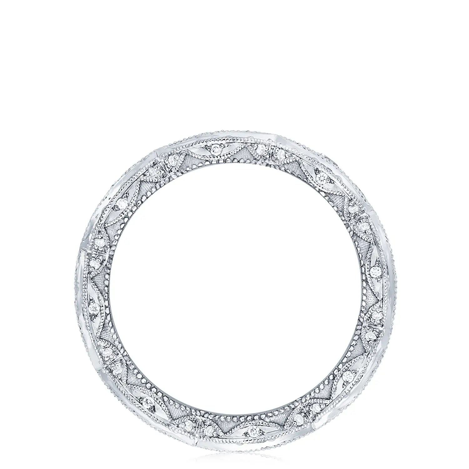 A breathtaking and unique beauty from our Adoration Collection, this Ladies band is truly fit for a queen. With lace like details, cascading multi-dimensional diamonds, and signature Tacori crescent detailing, this ring is sure to be the envy of all.