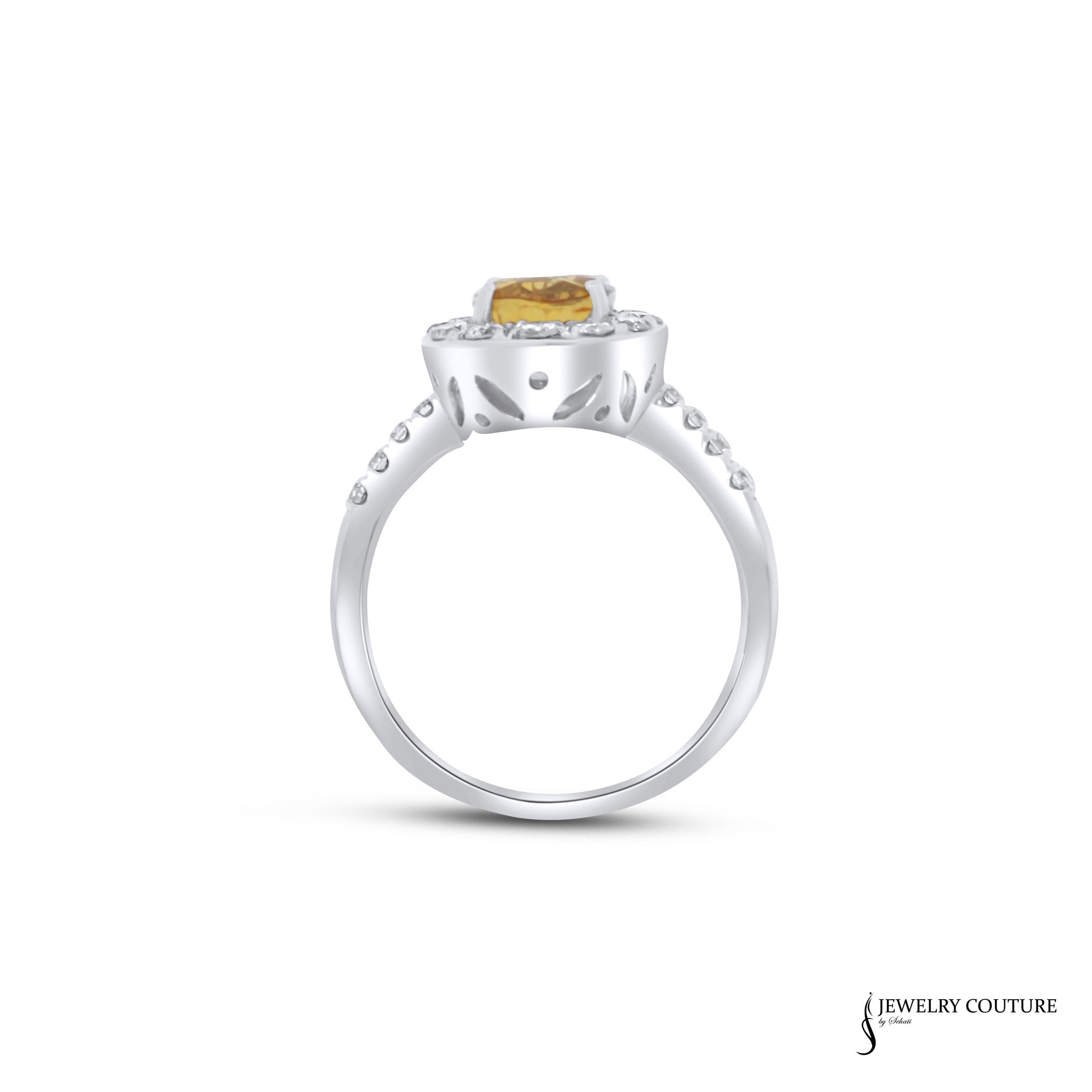 This 14KT White Gold ring features a stunning 2.40CT Orange round Sapphire center, surrounded by a total of 0.52CT in sparkling diamonds. The vibrant orange sapphire adds a touch of color to any outfit, while the high-quality materials and detailed design make this ring a timeless and elegant piece of jewelry.