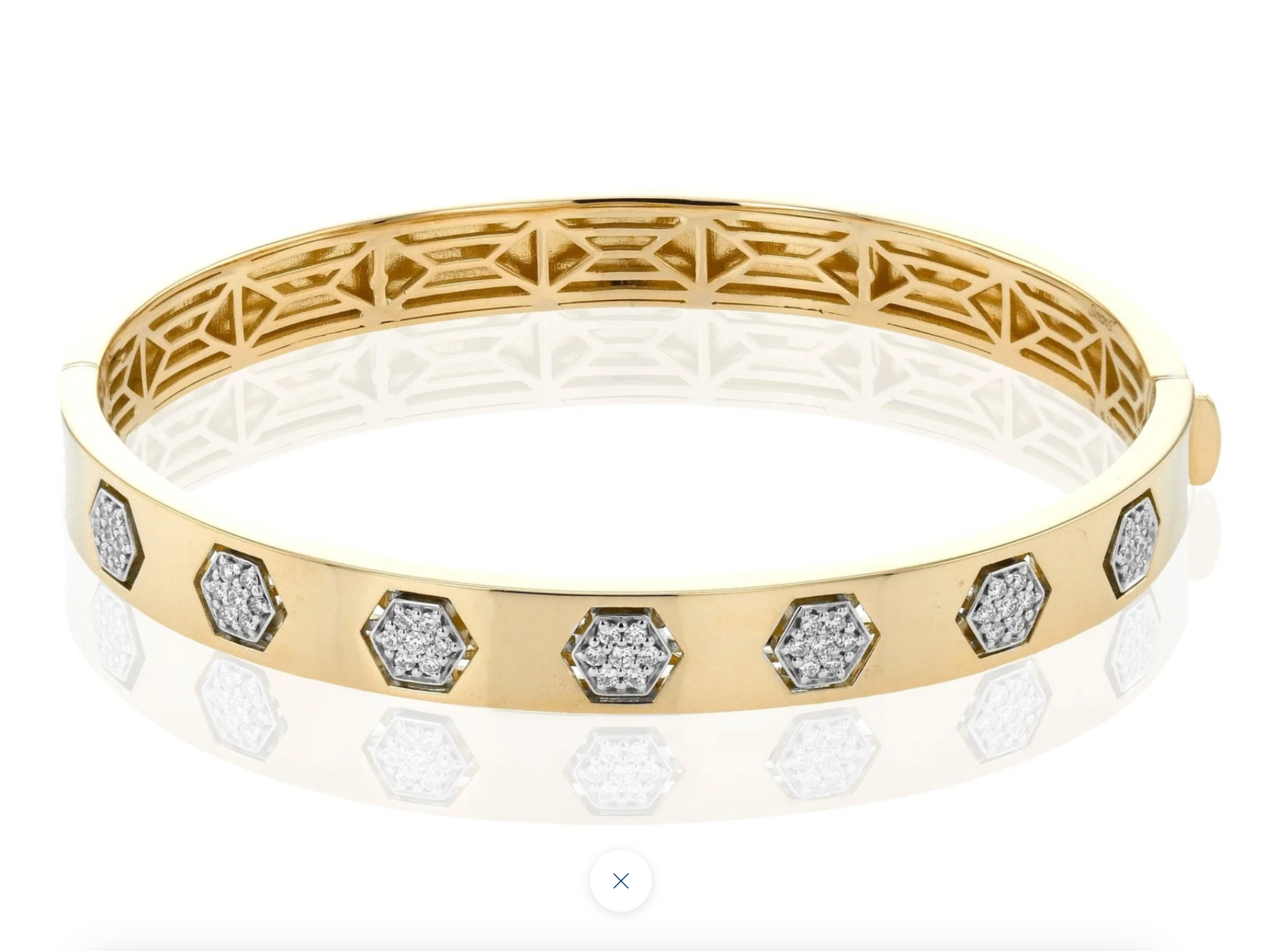 This elegant bracelet features an intricate design with sparkling diamond octagons along its outer edge.