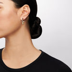 These dynamic hoop earrings feature shimmering white diamonds along the exterior of their distinctive shape.