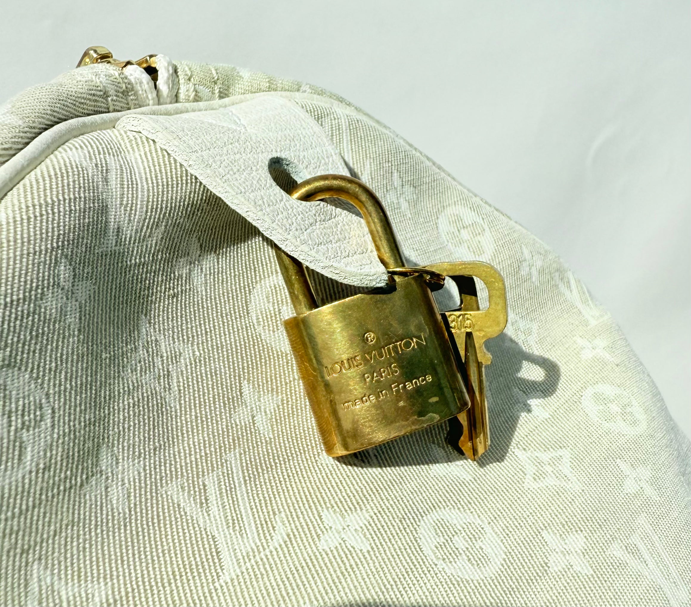 Sophisticated Louis vuitton 'Speedy 30' in beige (Dune) Monogram Idylle (also known as. 'mini lin' canvas). Ideal for everyday essentials, it features a zipper closure, double leather handles and gold metal hardware. The interior is lined with beige fabric. Inside it has 1 side open pocket. The Monogram Idylle Canvas is super light weight. Original padlock and key included.