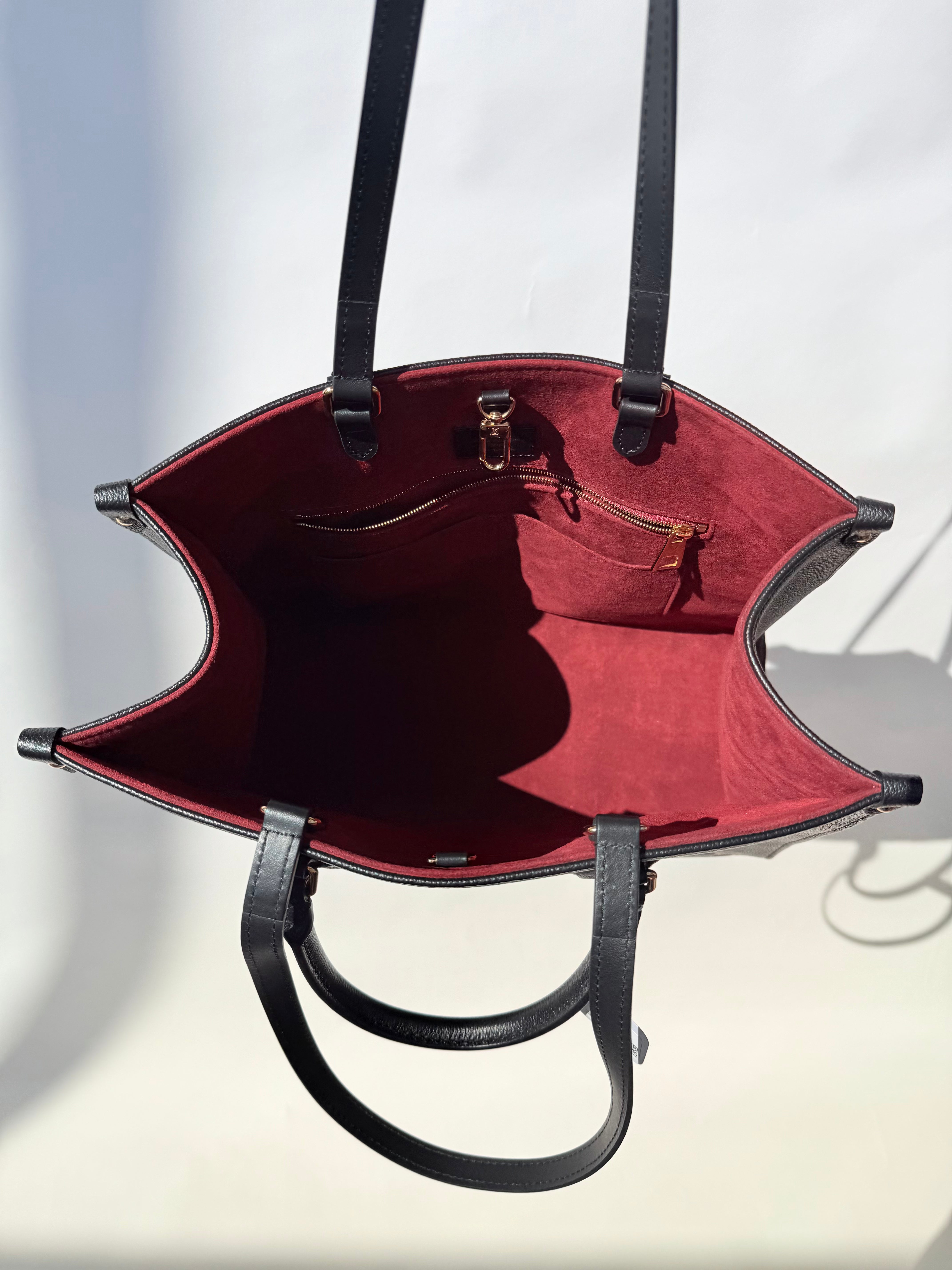 This is an authentic LOUIS VUITTON Empreinte Monogram Giant Onthego MM in Black and Beige. This limited edition tote is crafted of black calfskin with an oversized Louis Vuitton monogram print in beige. The bag features rolled leather top handles, long shoulder straps, and gold hardware. The top opens to a spacious burgundy microfiber interior with zipper and patch pockets.