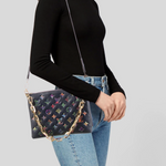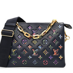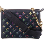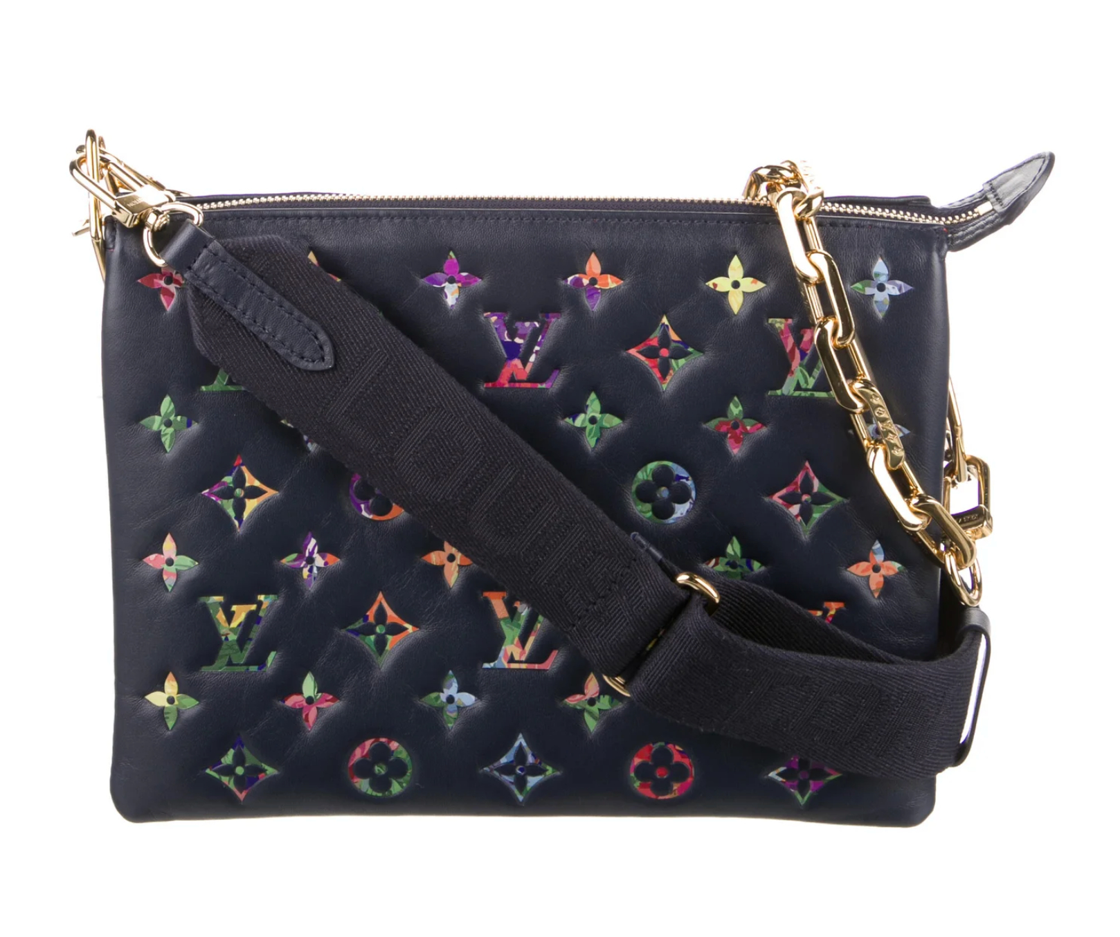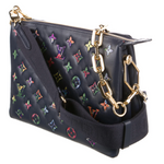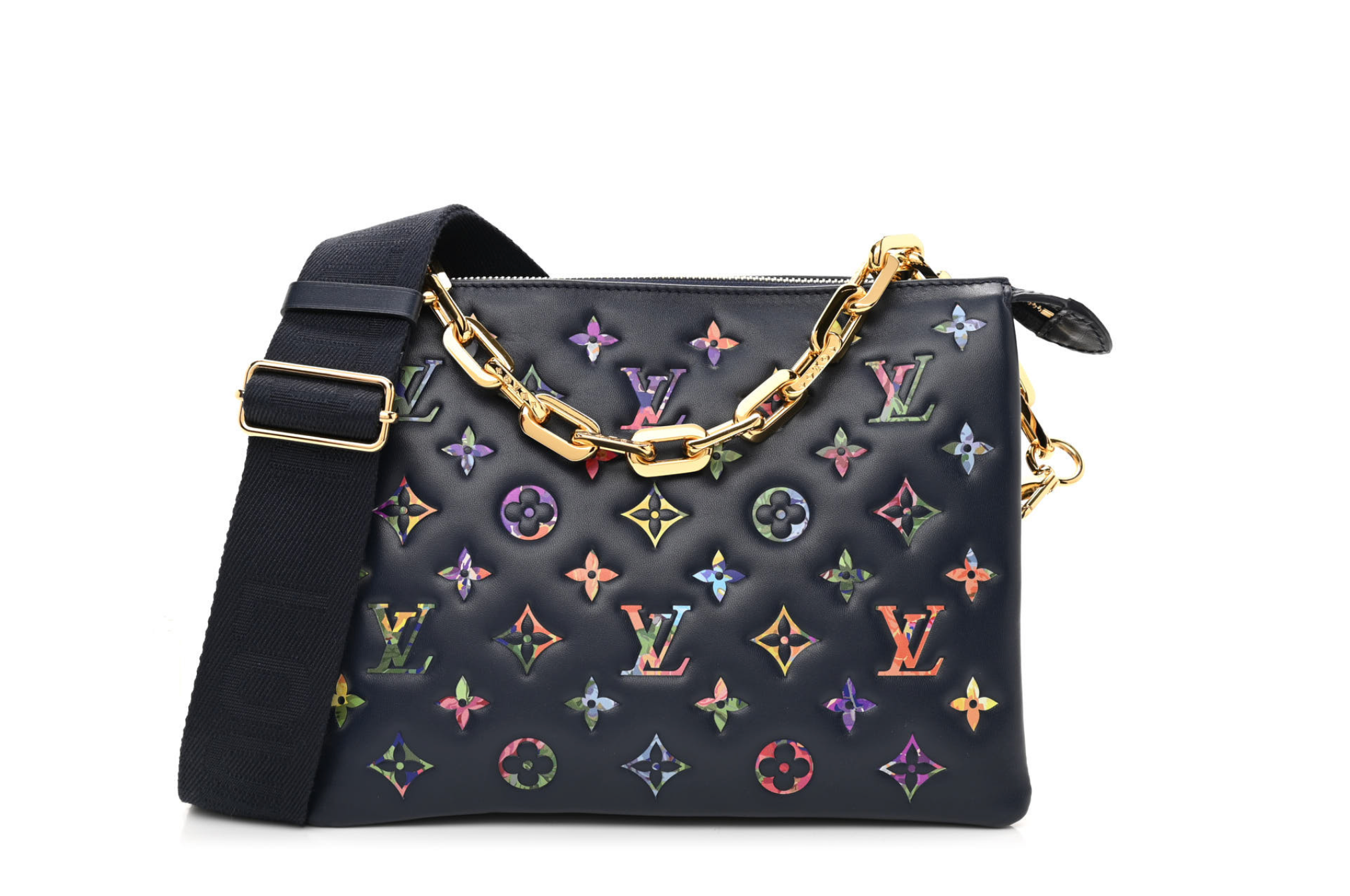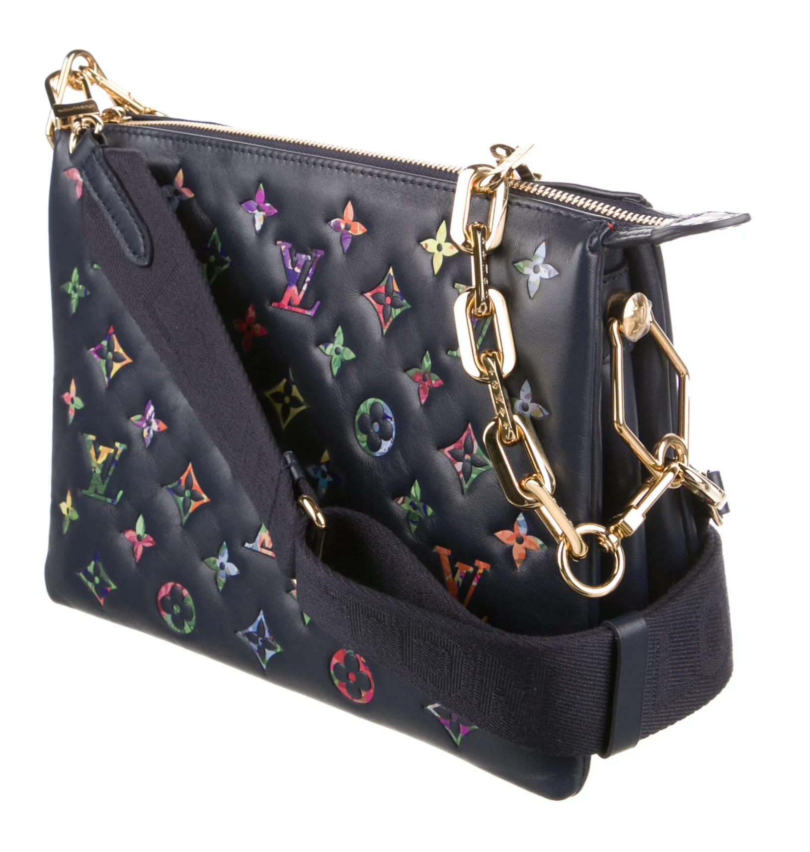This is an authentic LOUIS VUITTON Lambskin Embossed Monogram LV Garden Coussin PM in Navy. This shoulder bag is featured in puffy multi colored monogram-embossed lambskin leather in navy blue. This bag can be carried solo as a clutch, with the gold hardware Edge chain strap, or the adjustable blue strap for wearing crossbody, or on the shoulder. The top zipper opens to a partitioned coral microfiber interior with a central zipper compartment.