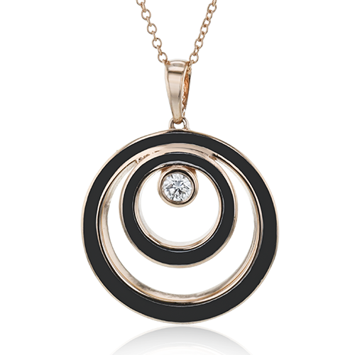 This distinctive pendant features a concentric design and is crafted with enamel and sparkling diamonds.