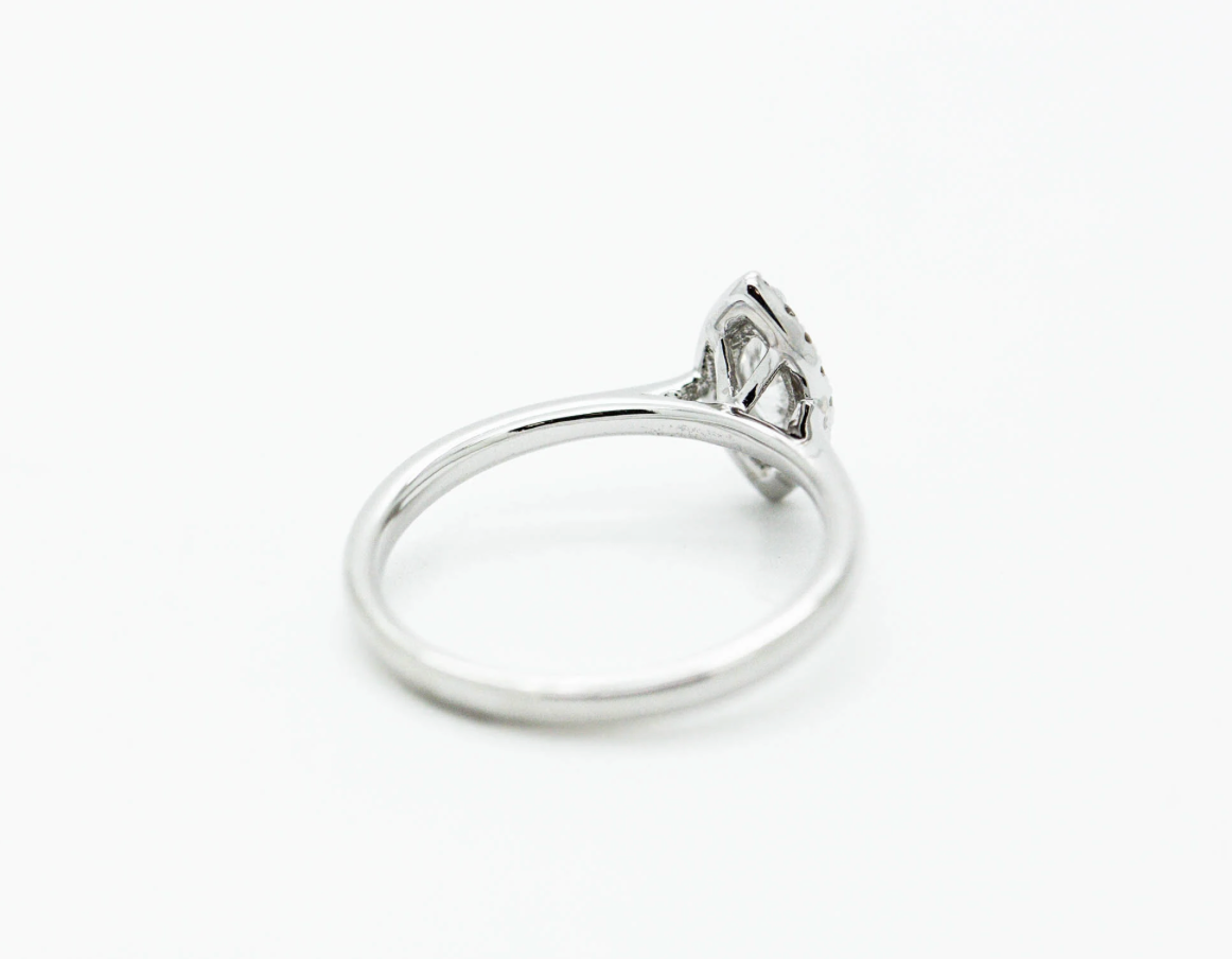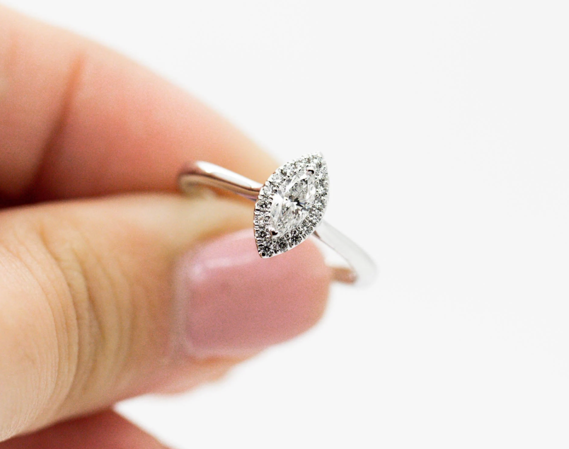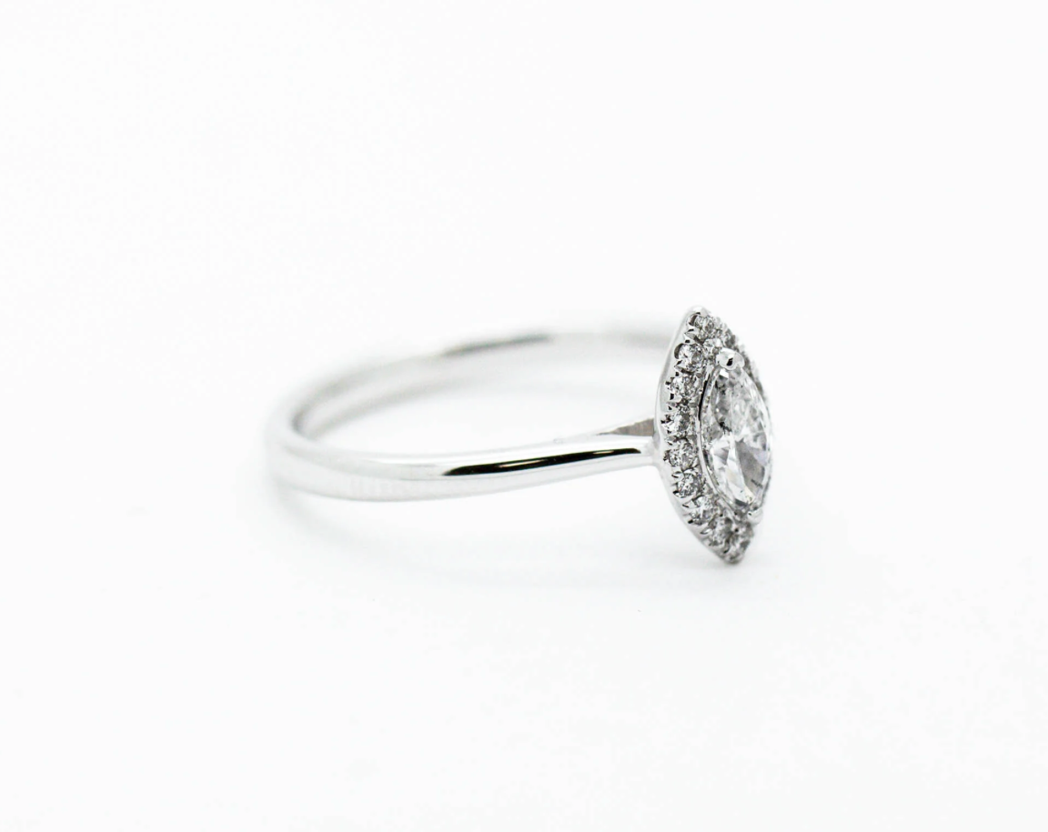 A clean cut marquise 0.31ct diamond engagement ring with a gorgeous halo of 0.11ct diamonds. This simple beauty is part of our in house collection.